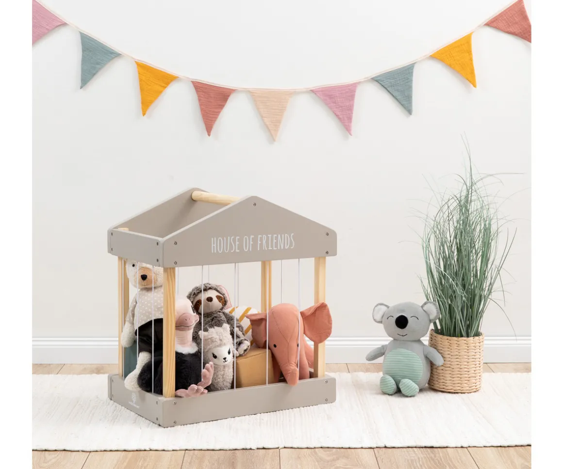 Sus bandas elásticas sujetan los peluches con seguridad, y gracias al asa de transporte, los niños pueden moverla de un sitio a otro sin esfuerzo. Una solución funcional que convierte el orden en parte del juego.