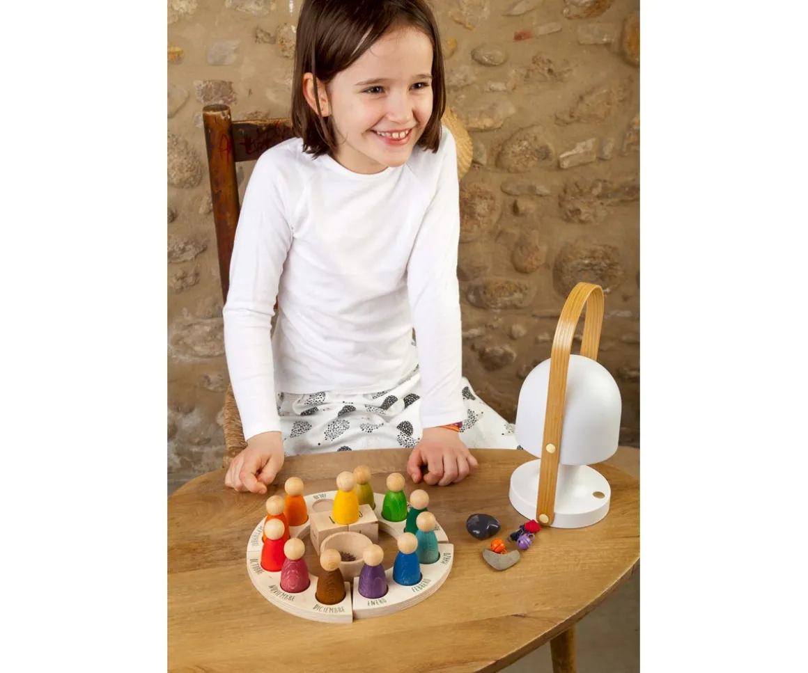 Calendario manipulativo y activo anual que permite al niño tocar el año y comprender el paso del tiempo a través de la experiencia.