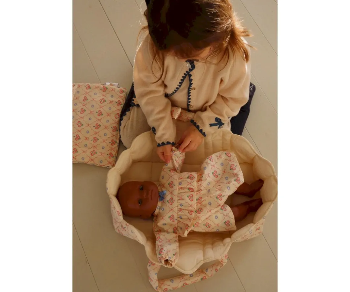Este capazo para muñecas acolchado de Konges Slojd con su diseño dulce decorado con lacitos, es ideal para transportar a tu muñeca fácilmente a todas partes, gracias a sus cómodas asas.