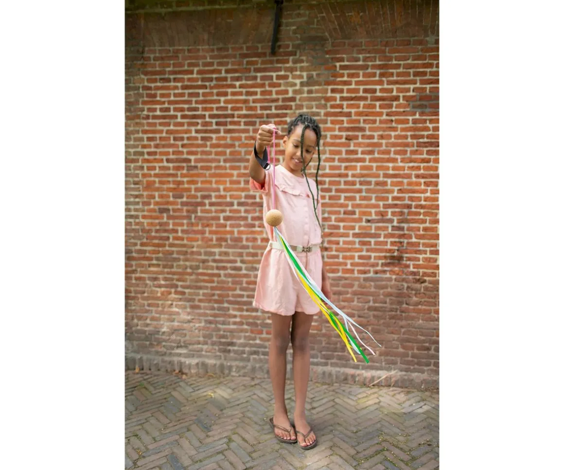 - Materiales: Pelota de madera y corcho y cintas de tela
