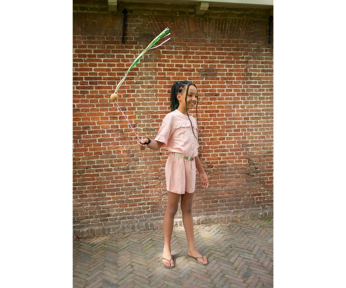 - Medidas: Mango de 21.5 cm, cuerda de 41 cm, bola de 6 cm de diametro, cintas de 140 cm