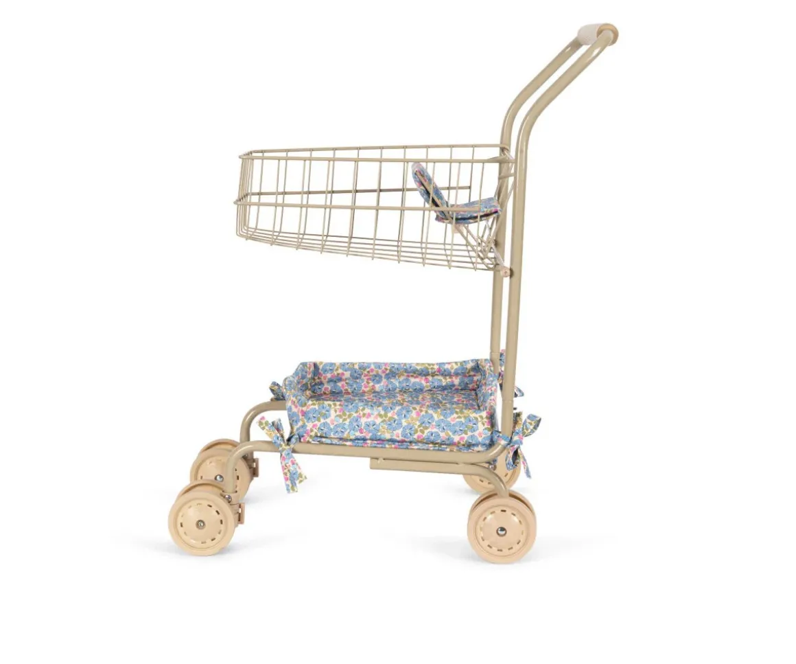 Original carrito de compras con un bonito estampado de flores, con ruedas delanteras giratorias, cestita de gran capacidad y bandeja inferior de tela para que los pequeños compradores puedan almacenar todos sus artículos de compra. En la bandeja superior dispone de un asiento para colocar al muñeco