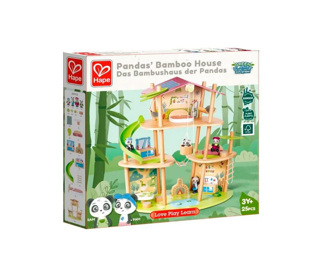 ¡Anima a tu peque a cuidar de la naturaleza y de los animales con esta encantadora casa de bambú y la divertida familia de los osos pandas! Con esta casa de bambú y su familia de pandas tu peque aprenderá la importancia de una vida sostenible y de proteger a los animales para poder disfrutar de nuestro maravilloso planeta, mientras se divierte jugando.