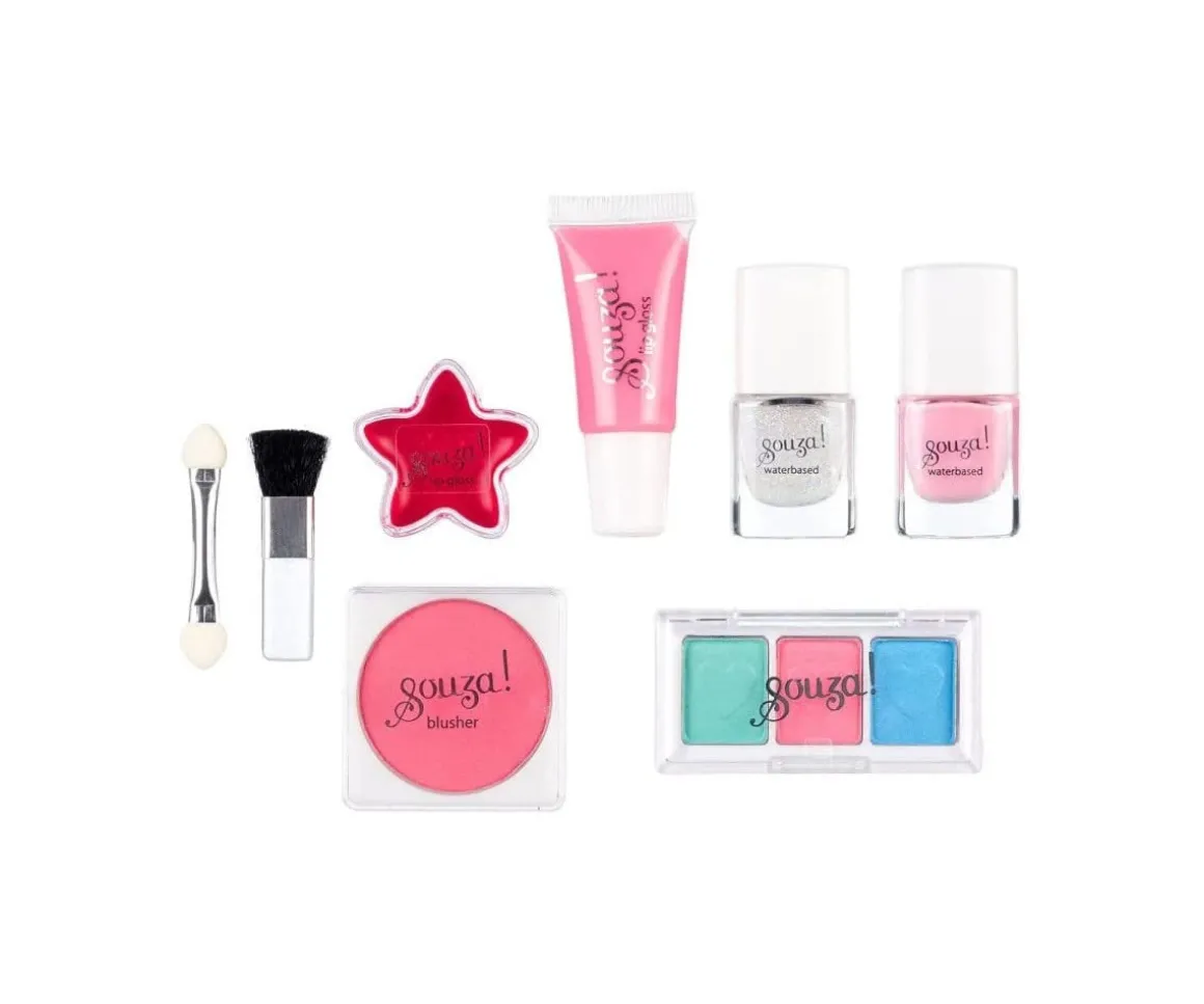 - Contiene: 2 esmaltes de uñas a base de agua, 3 sombras de ojos, 2 brillos de labios, 1 colorete, 2 aplicadores