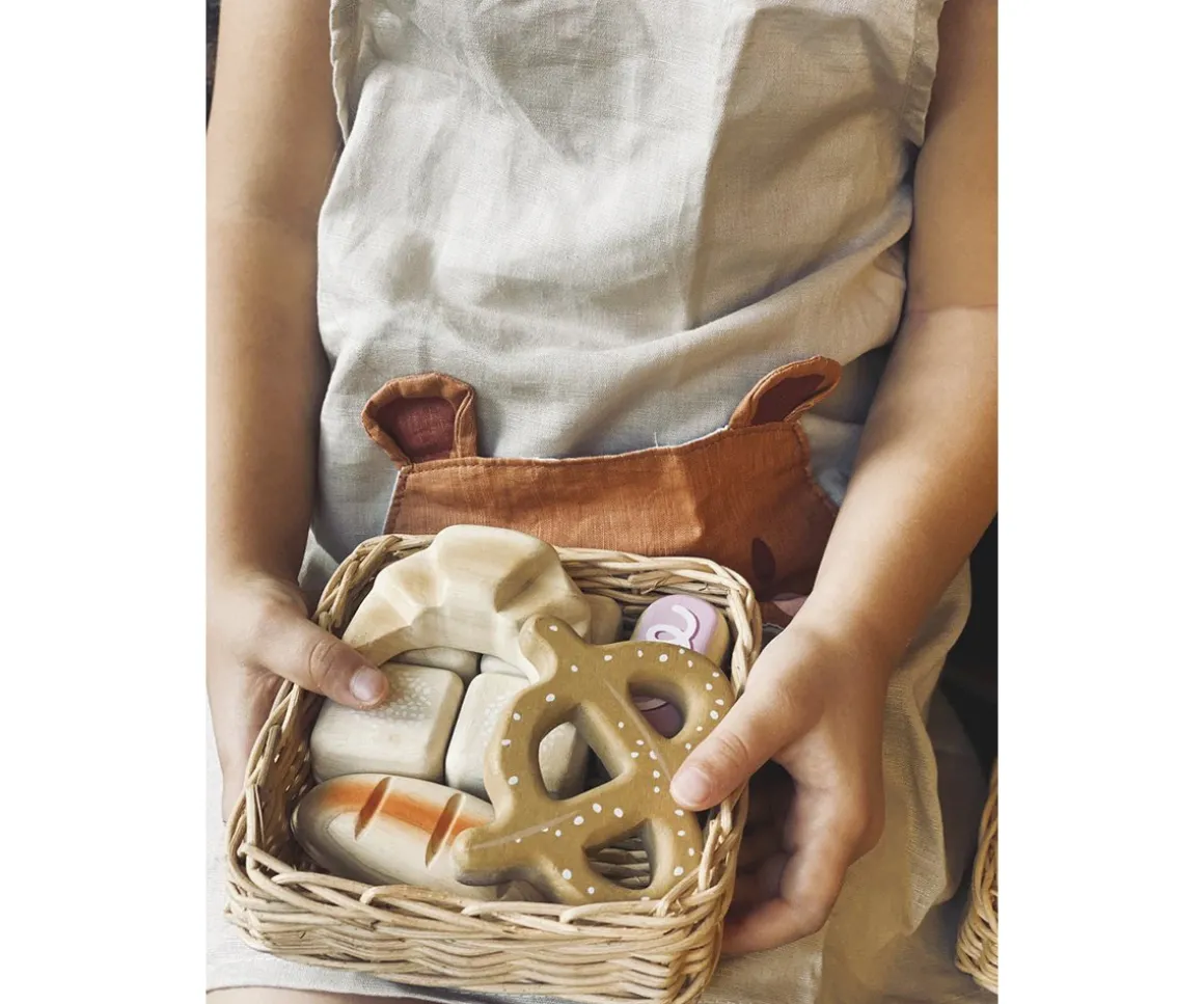 Canasta de mimbre hecha a mano con deliciosos panes de juguete: incluye croissant, panecillo helado, pretzel, baguette y 4 panecillos para compartir. ¡Un accesorio perfecto para cualquier cocina de madera o puestos de mercado de imitación!