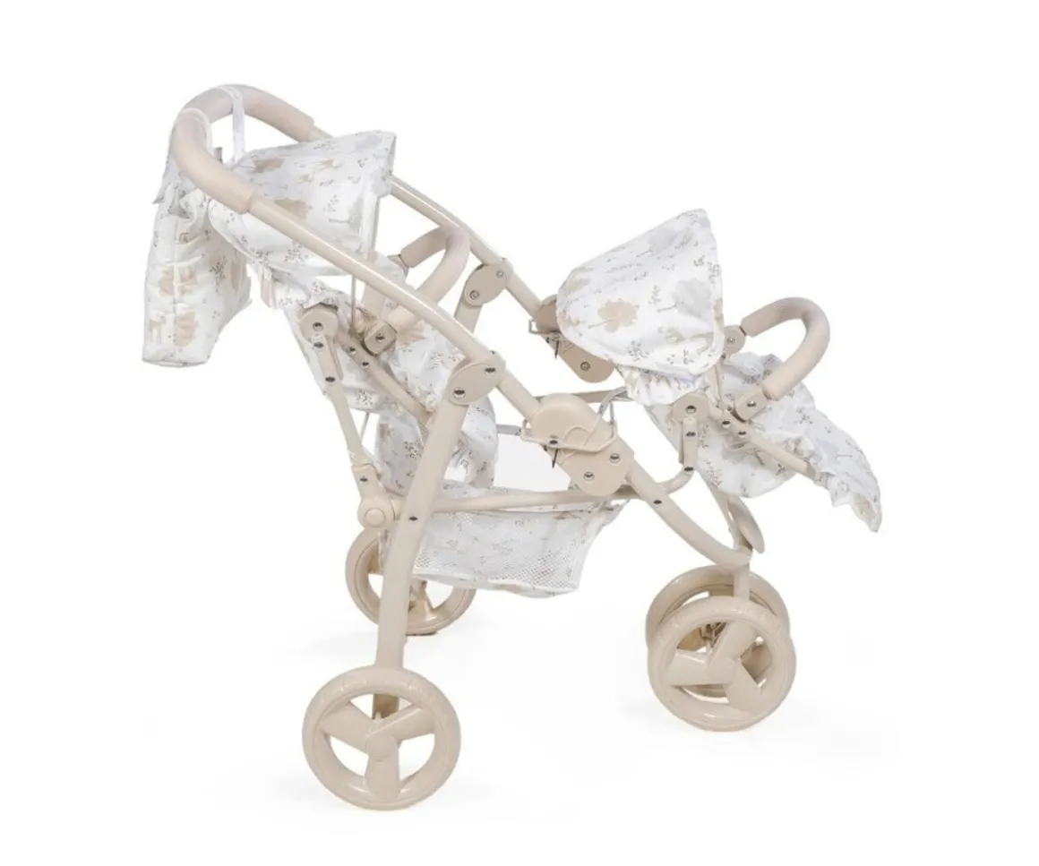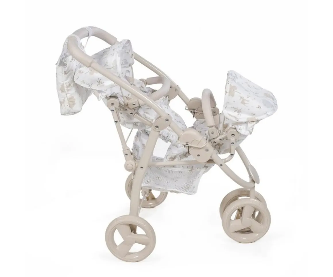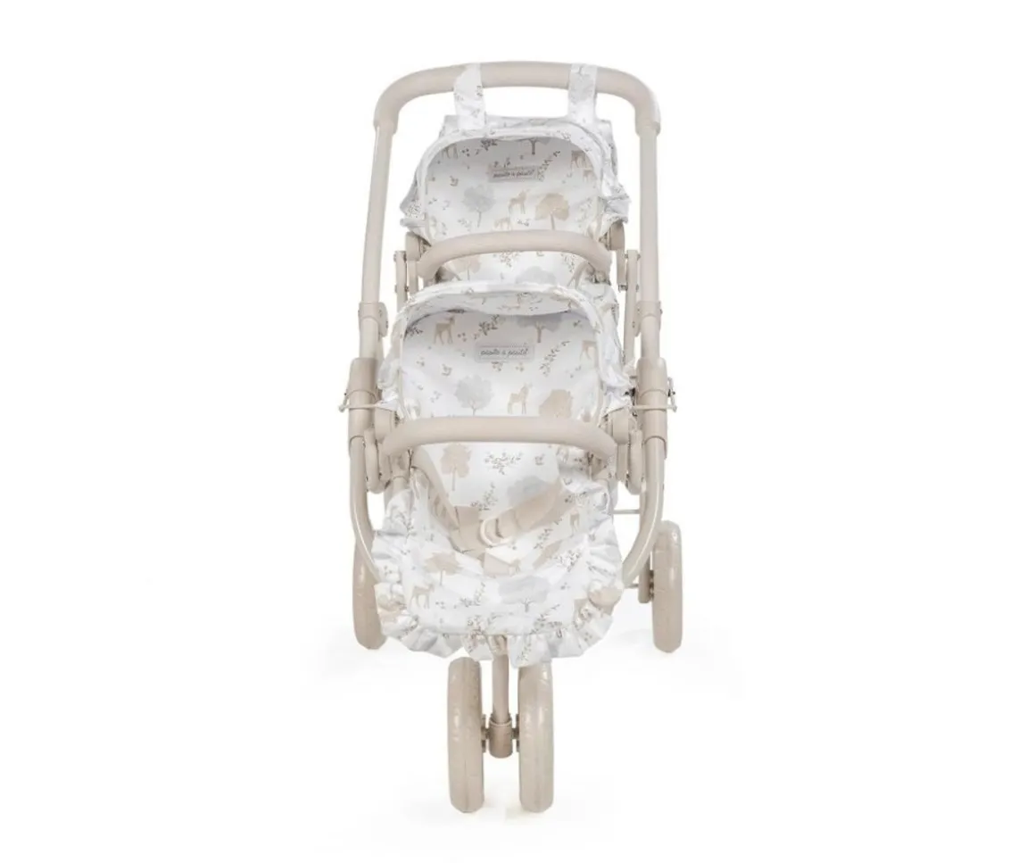 Pasea muñecas en el cochecito gemelar Nara de Pasito a Pasito, perfecto para muñecas de 30 a 42 cm, este cochecito con dos asientos en tándem te permitirá llevar a varias de muñecas de paseo a la vez. Es plegable, ocupa poco espacio y tiene un fácil montaje.