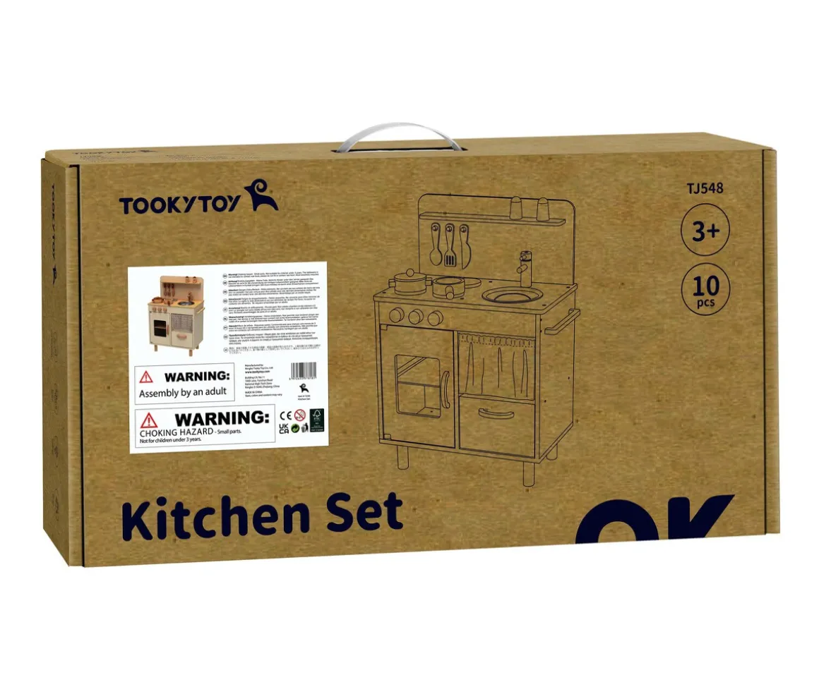 - Incluye: cocina de madera, 8 accesorios de madera (sartén, olla con tapa, salero, pimentero, espátula, cuchillo y cucharón)