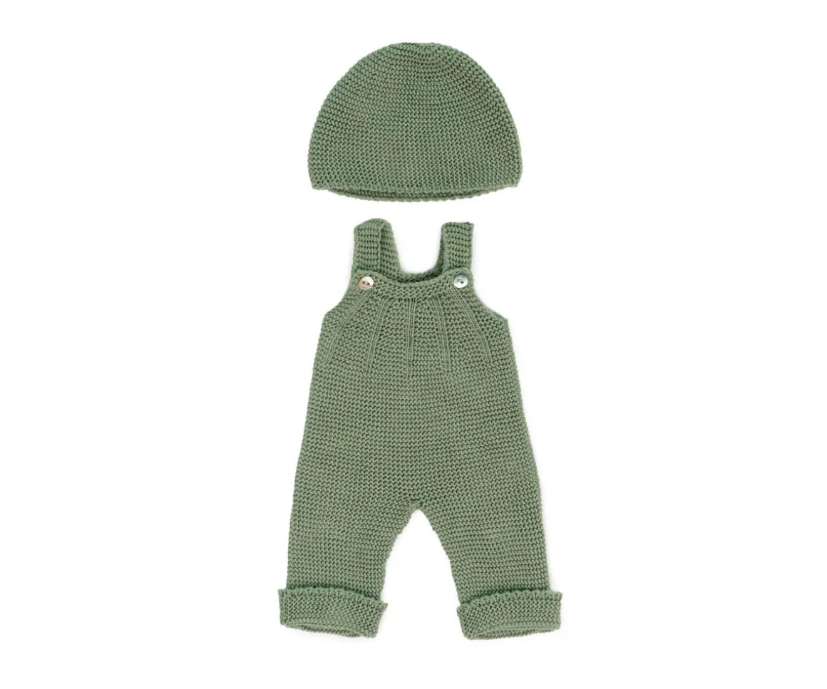 Conjunto de ropita para muñecas compuesto por un bonito peto de tirantes y un gorrito.