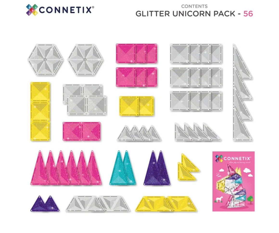 El Glitter Unicorn Pack de 56 piezas de Connetix es un set mágico de construcción con imanes que enamora desde el primer destello. Diseñado para amantes de los unicornios, soñadores de fantasía y pequeños exploradores creativos, este pack está repleto de piezas translúcidas con purpurina en tonos vivos de rosa, amarillo, turquesa y morado.