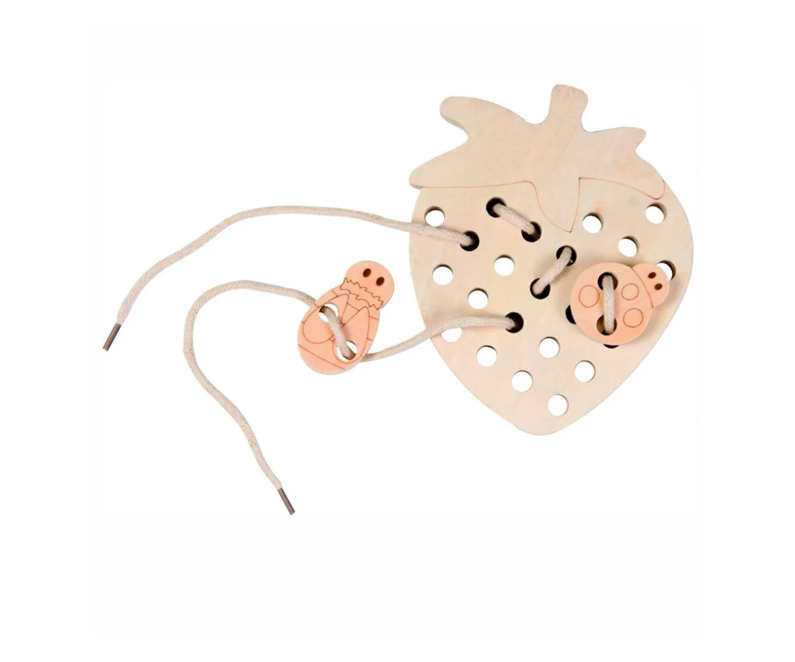Con este divertido juego de cordones los peques aprederán muy rápido a enhebrar la fresa con sus deditos. Será un buen comienzo para aprender a coser y fomentar la motricidad.