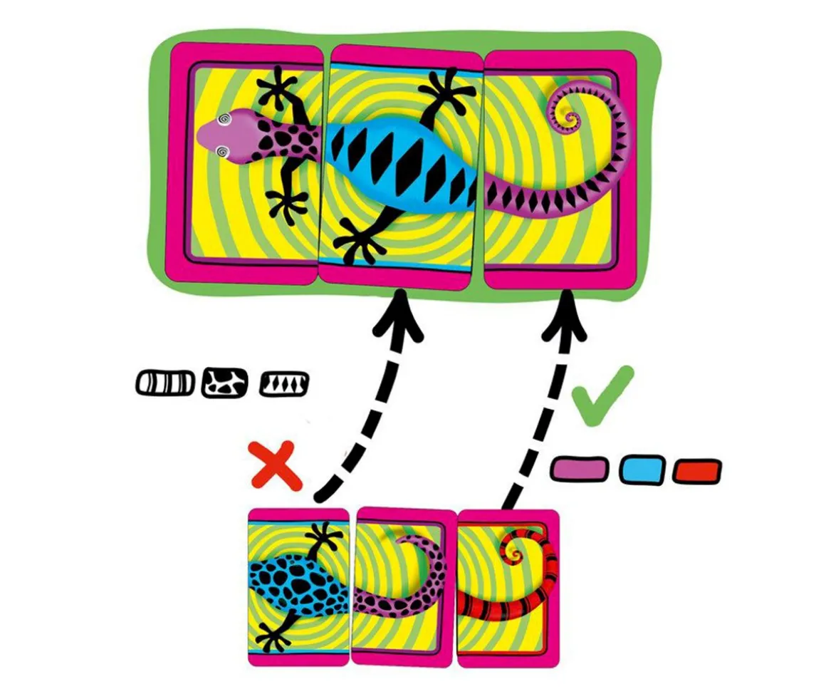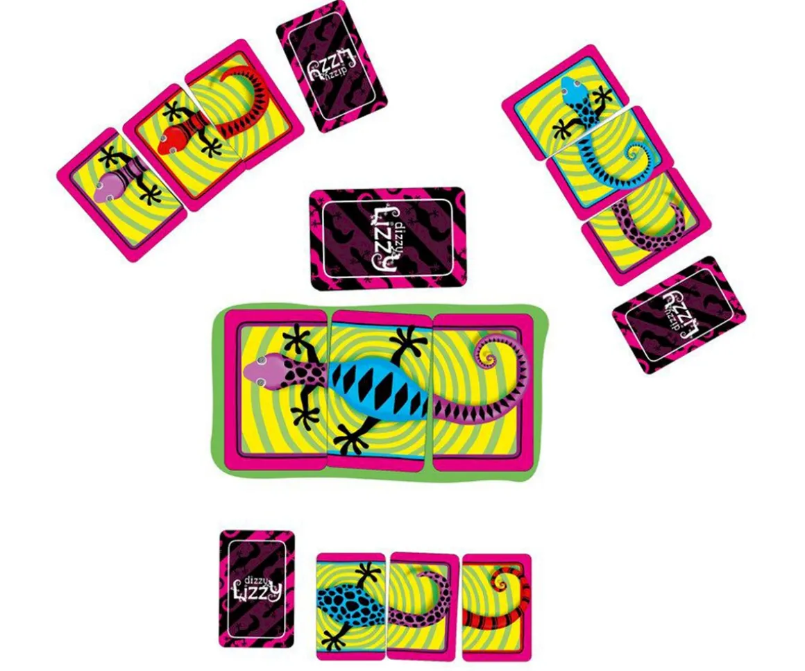 Tres partes del cuerpo, tres colores y tres patrones. Combínalos colocando nuevas cartas encima de Lizzy, una cada vez. A medida que Lizzy cambia de color y patrón, los jugadores deben crear combinaciones ganadoras. Nunca se está quieta, siempre está en constante cambio. Todo lo que necesitas para una diversión vertiginosa.