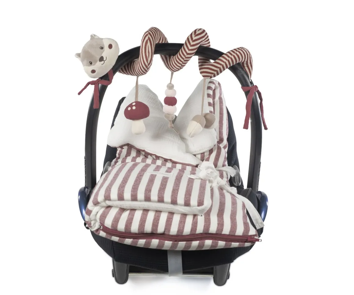 Sonidos y texturas sorprendentes con esta preciosa espiral de actividades ideal para colocarla en la silla de paseo para estimular los sentidos del bebé durante o en el viaje en coche.