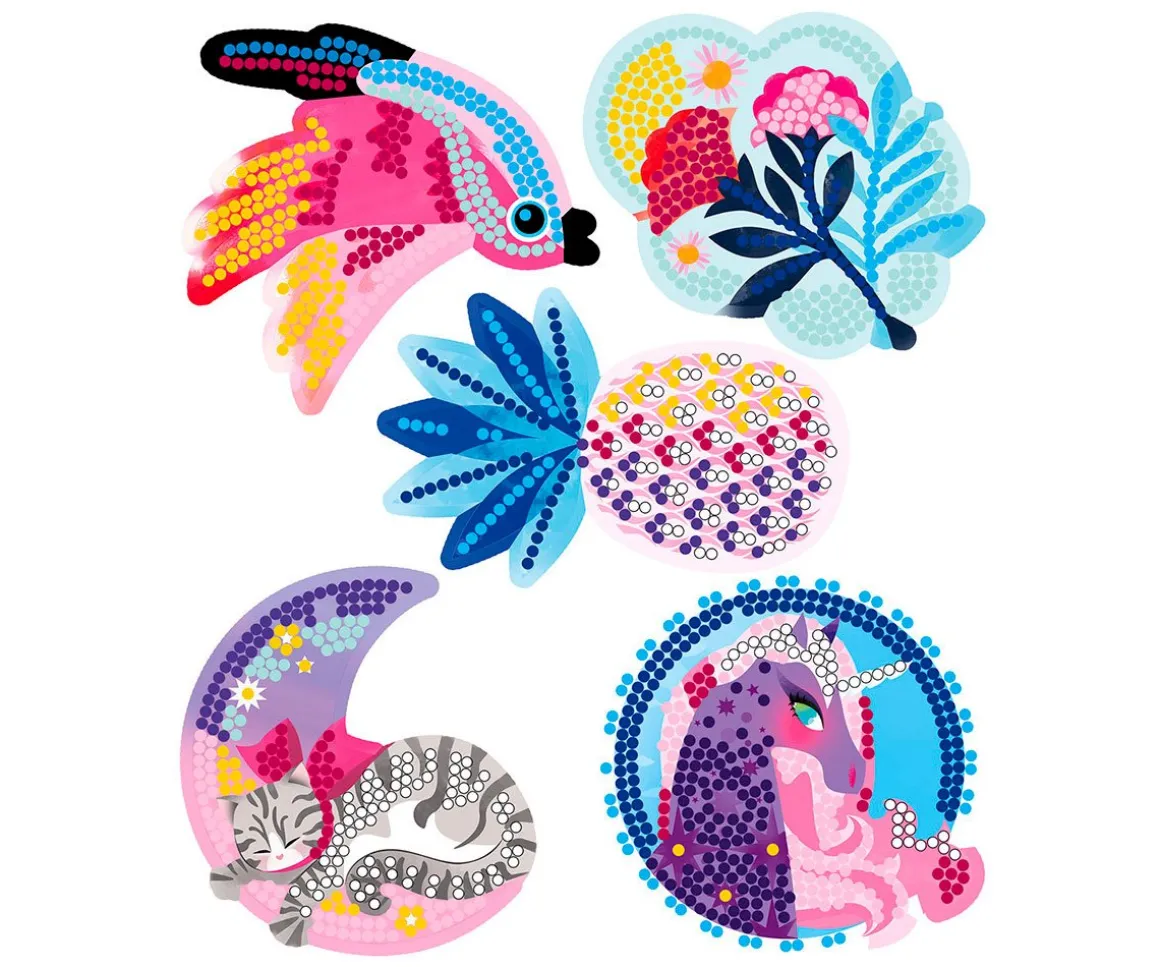 Contiene: 5 decoraciones adhesivas para completar con 1500 estrás minis, 5 cintas.