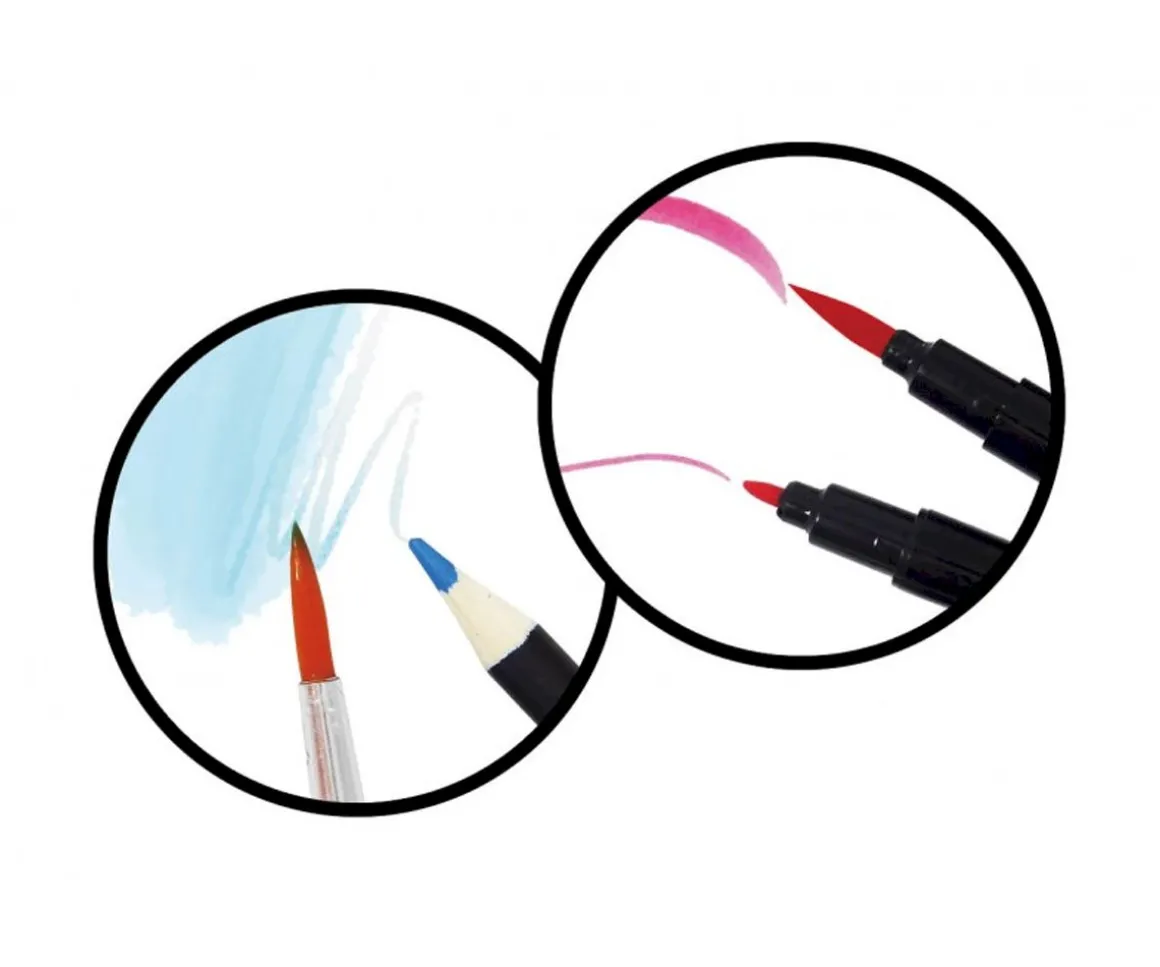 - Incluye: plantillas, 30 siluetas, estación de moda, tela autoadhesiva, plumas, purpurina, fieltro, cintas, rotuladores, lápices acuarelables, tijeras, sacapuntas
