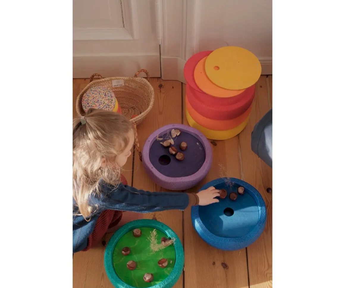 Stapelstein mezla los discos rodantes de Grimm’s, en colores diferentes que cuentan con 3 orificios de diferentes tamaños y vienen acompañados de 3 bolas de tamaños y colores diferentes, con sesis Stapelstein Original en los colores del arco iris classic.