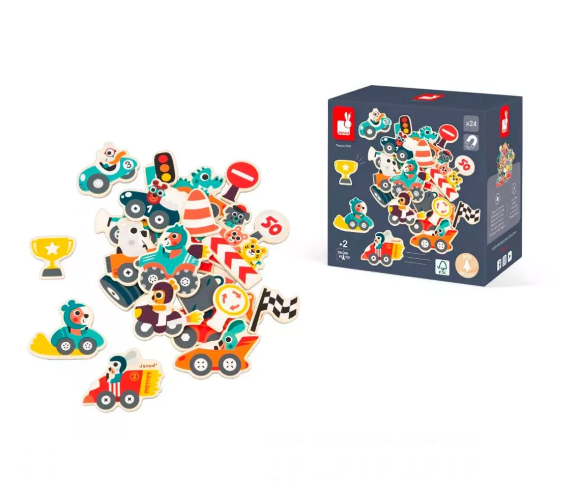 Los peques podrán hacer carreras con los diferentes personajes y sus coches de carreras con este bonito lote de imanes.
