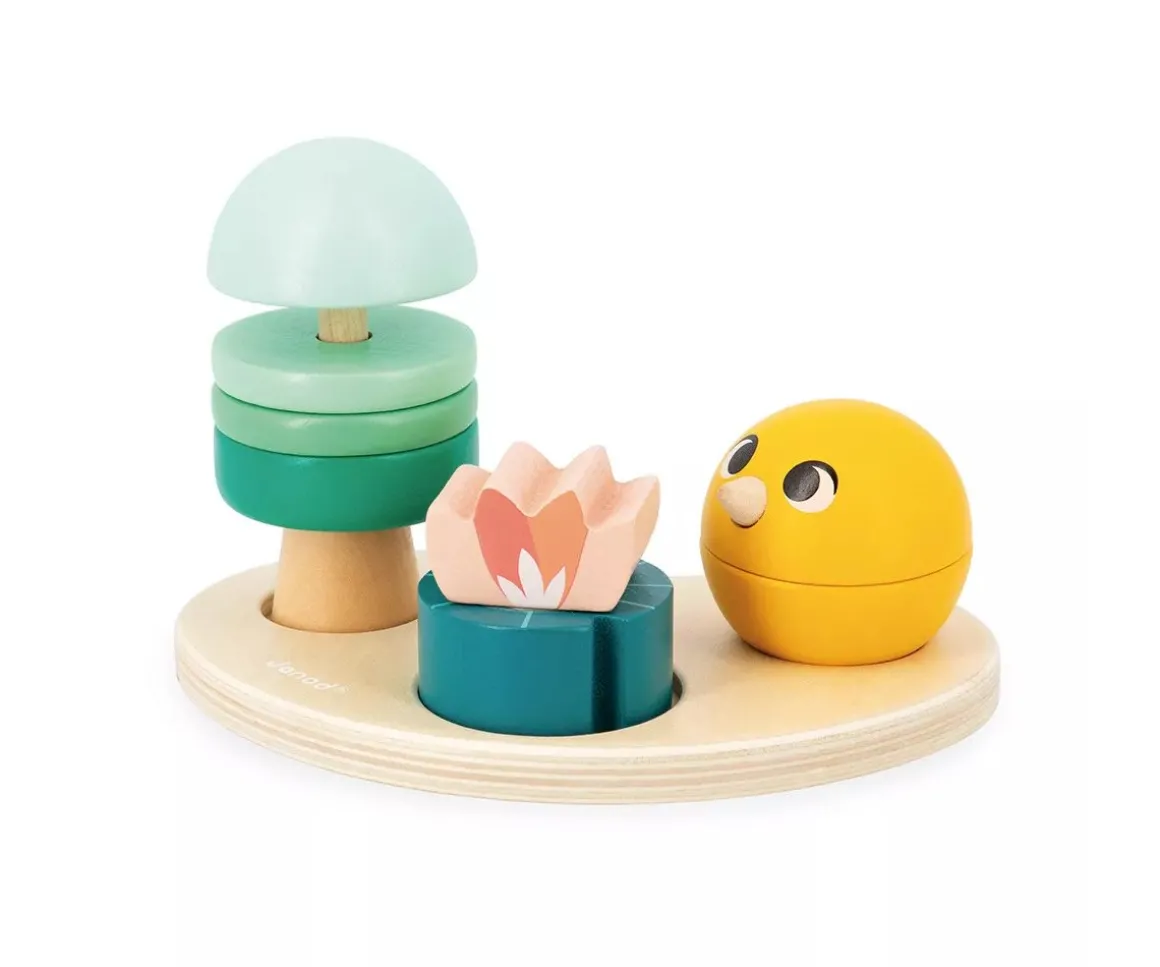 - Puzzle de madera: compuesto por 4 piezas de diferentes formas y colores, ayuda al bebé a desarrollar su motricidad fina y vocabulario al encajar los elementos en su sitio.