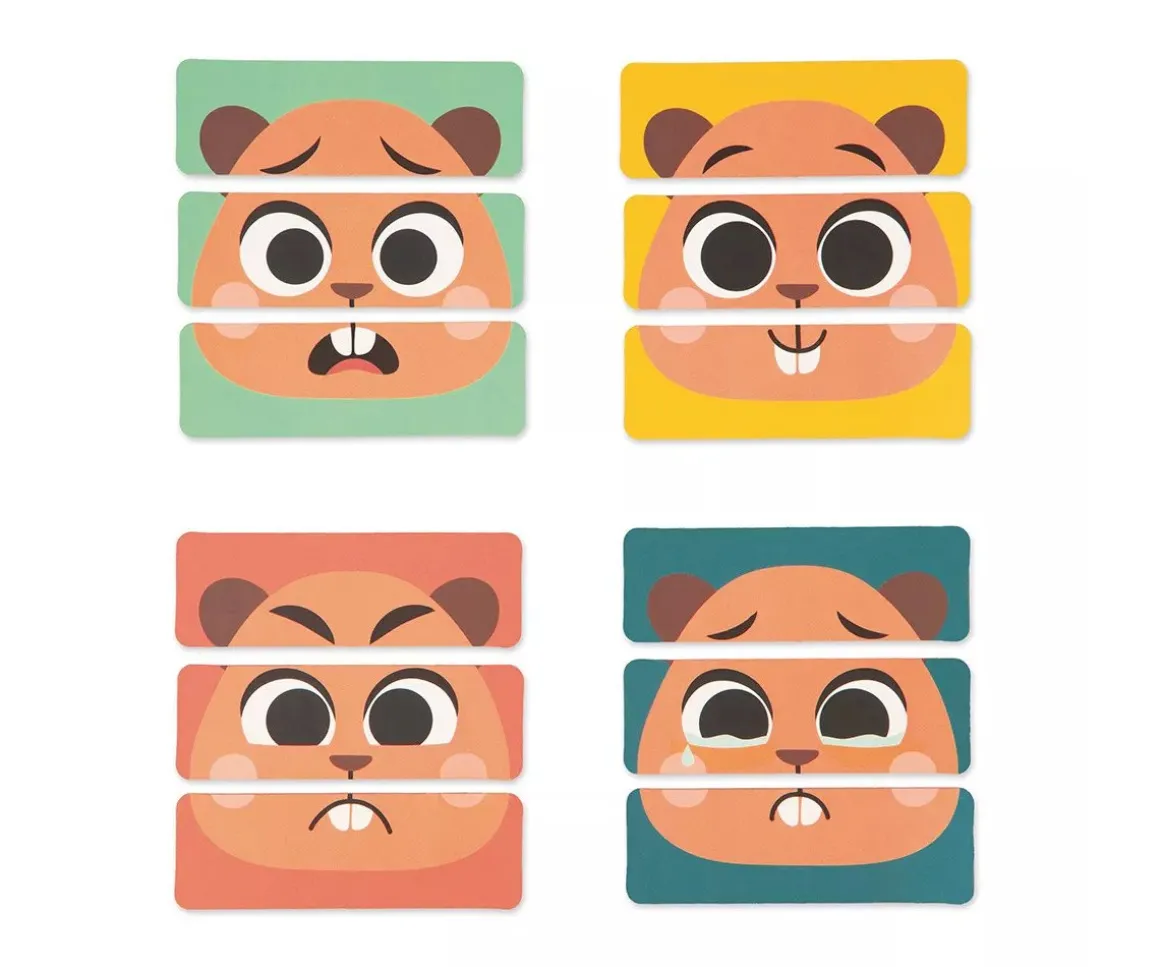 - Puzzle de madera: puzzle de las emociones. Con un bonito castor podrá identificar las diferentes 4 emociones (alegría, tristeza, miedo y enfado) para orientar al peque.