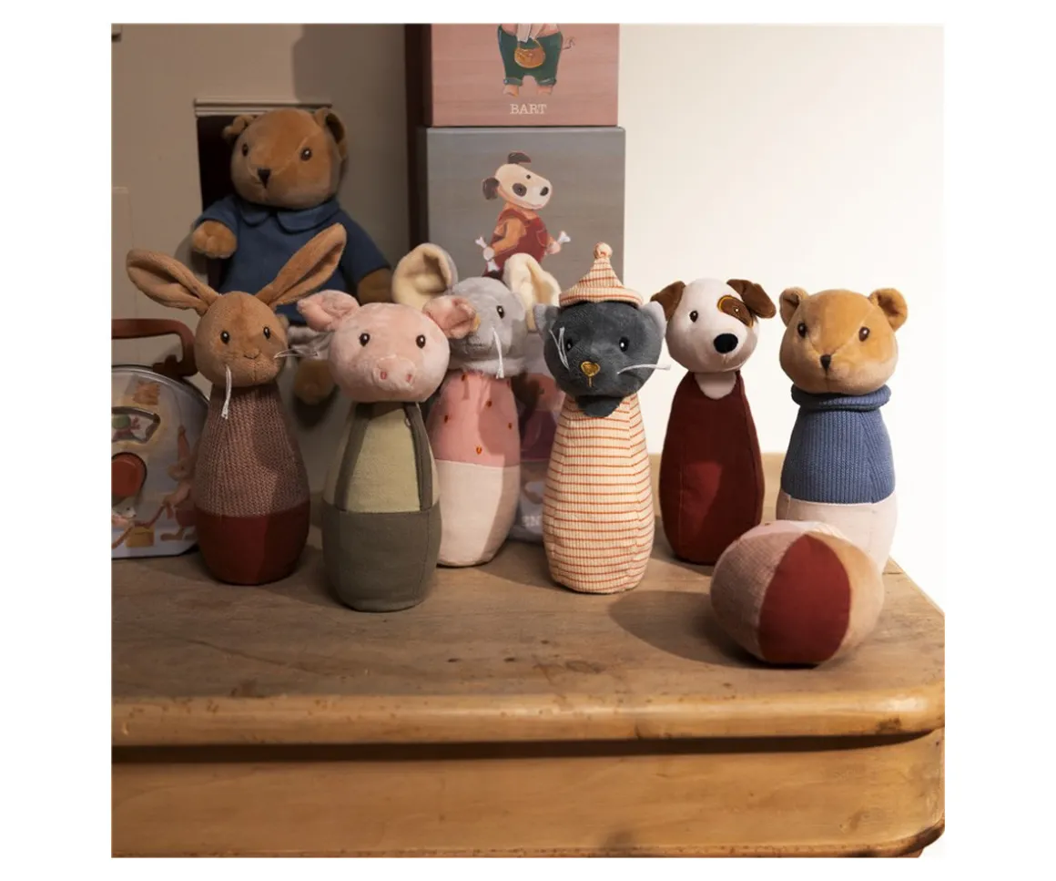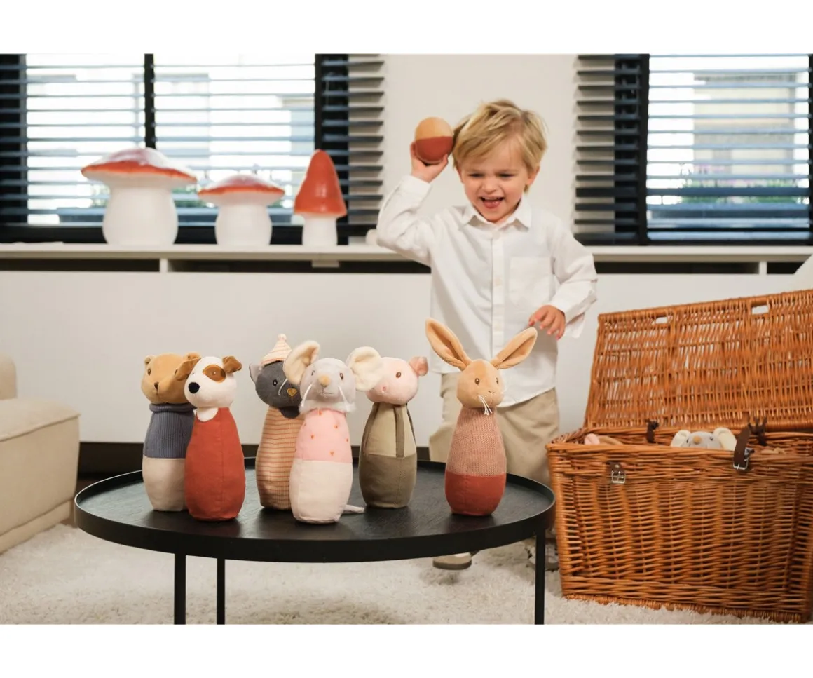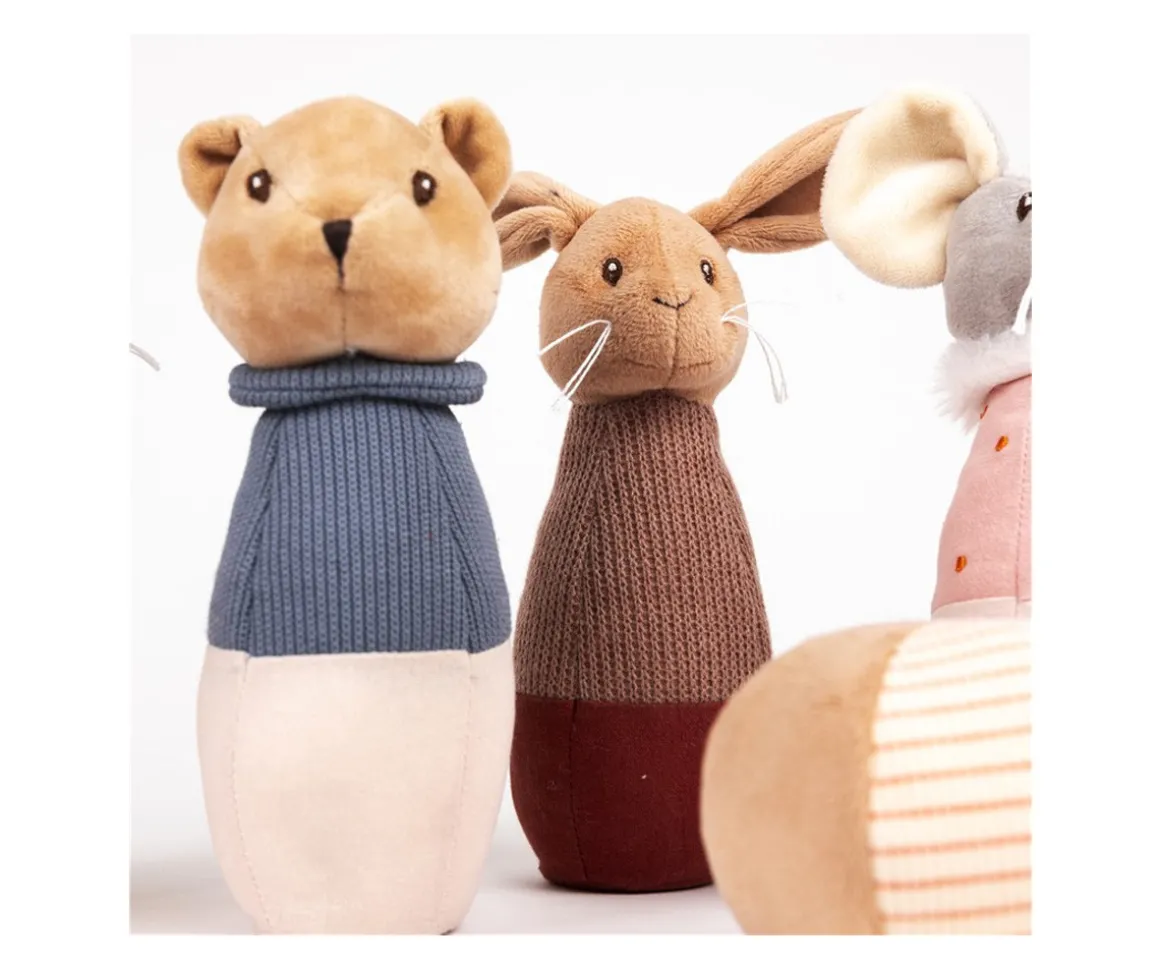 Cada bolo incluye un sonajero suave, añadiendo un elemento sensorial que cautiva la atención de los niños mientras hacen rodar la pelota para derribar a sus simpáticos amigos.