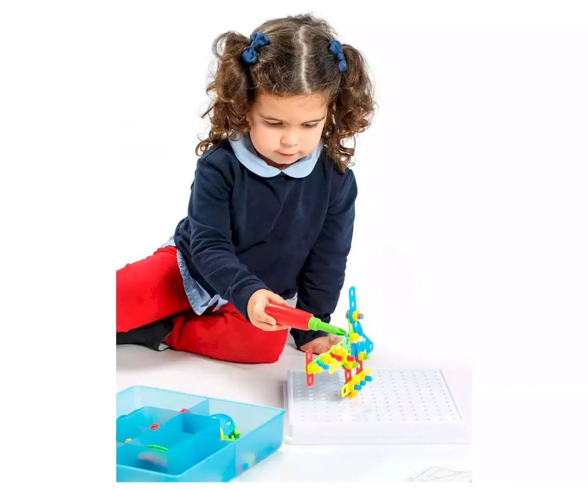 - Incluye: fichas con las diferentes actividades que complementan el juego, 180 piezas, soporte de montaje, contenedor de plástico, plaquetas,regletas, tornillos,destornillador y 12 fichas de actividades