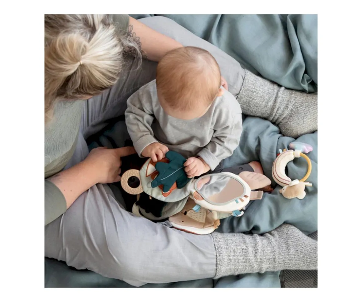 En una de las páginas, podrán encontrar un espejo, explorando su rostro. Diferentes texturas y solapas divertidas que fomentan el sentido del tacto, y sonidos de papel crujiente y chirriante que estimulan el oído. Al final, un anillo de dentición proporciona alivio a los bebés que están en proceso de dentición.