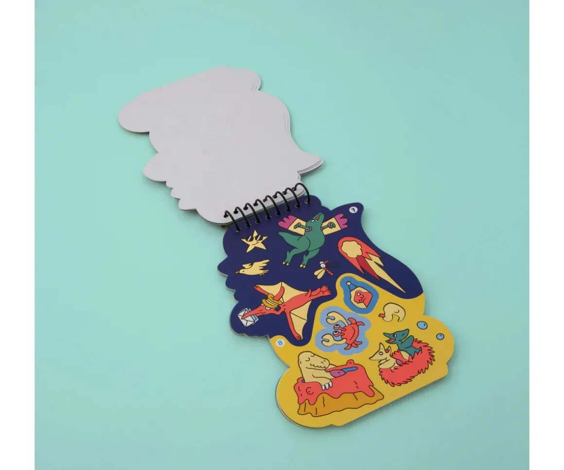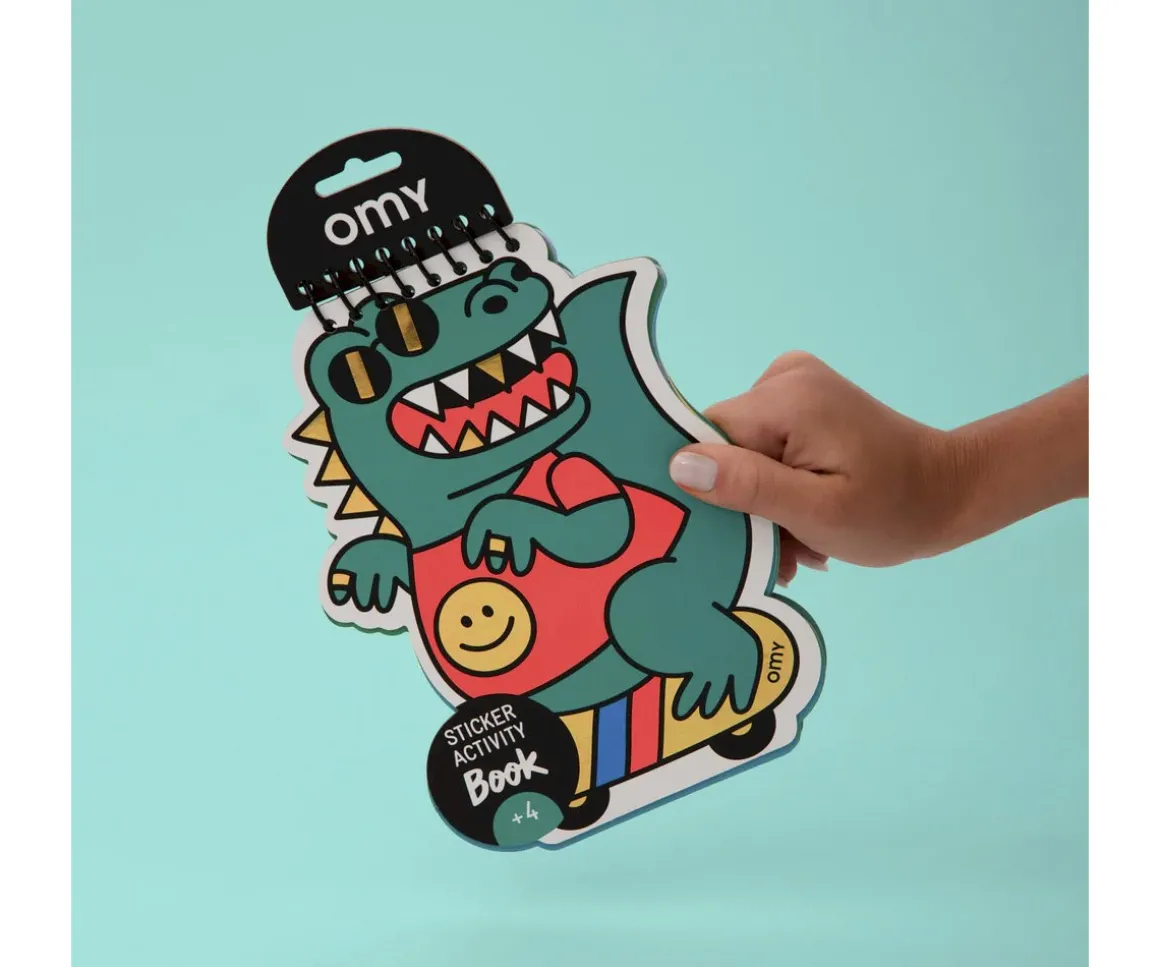 Cuaderno de actividades Omy con ilustración de un divertido dinosaurio y que en su interior, podrás encontrar divertidas pegatinas de neón, doradas y holográficas para desatar la imaginación de los peques.