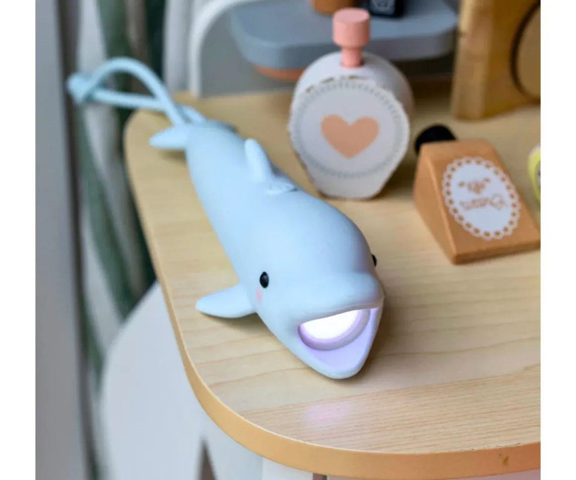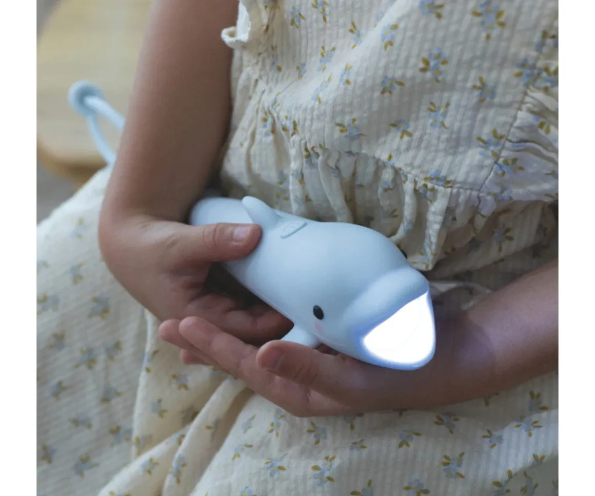 Original linterna recubierta de silicona suave con forma de delfín que los peques podrán usar en aventuras nocturnas al aire libre, en juego de sombras en casa o para contar cuentos antes de dormir.