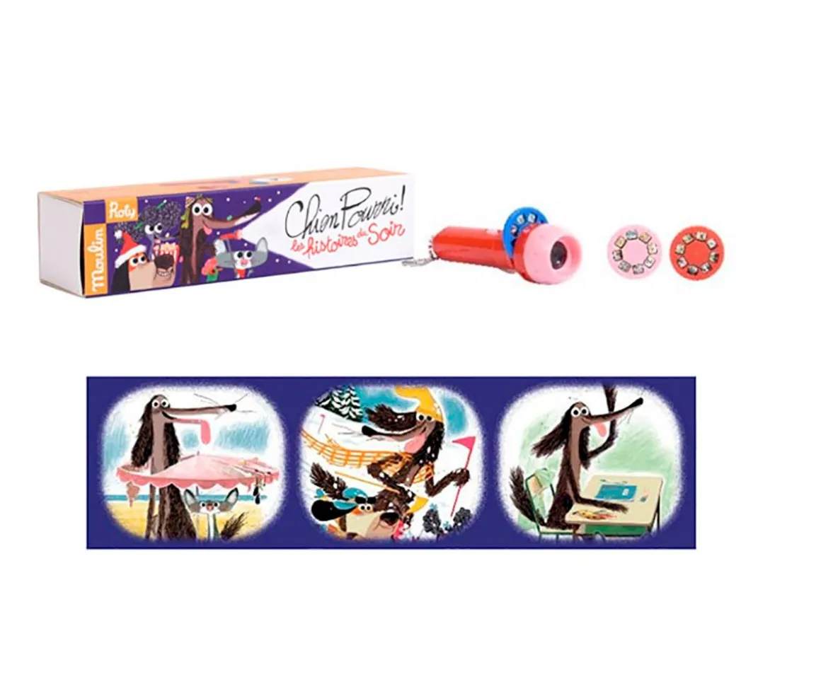 Se compone de una pequeña linterna (lleva las pilas incluidas) a la que se le pueden insertar las ruedas con diferentes imágenes, de temática relacionada que nos darán pie para inventar cuantas historias queramos.