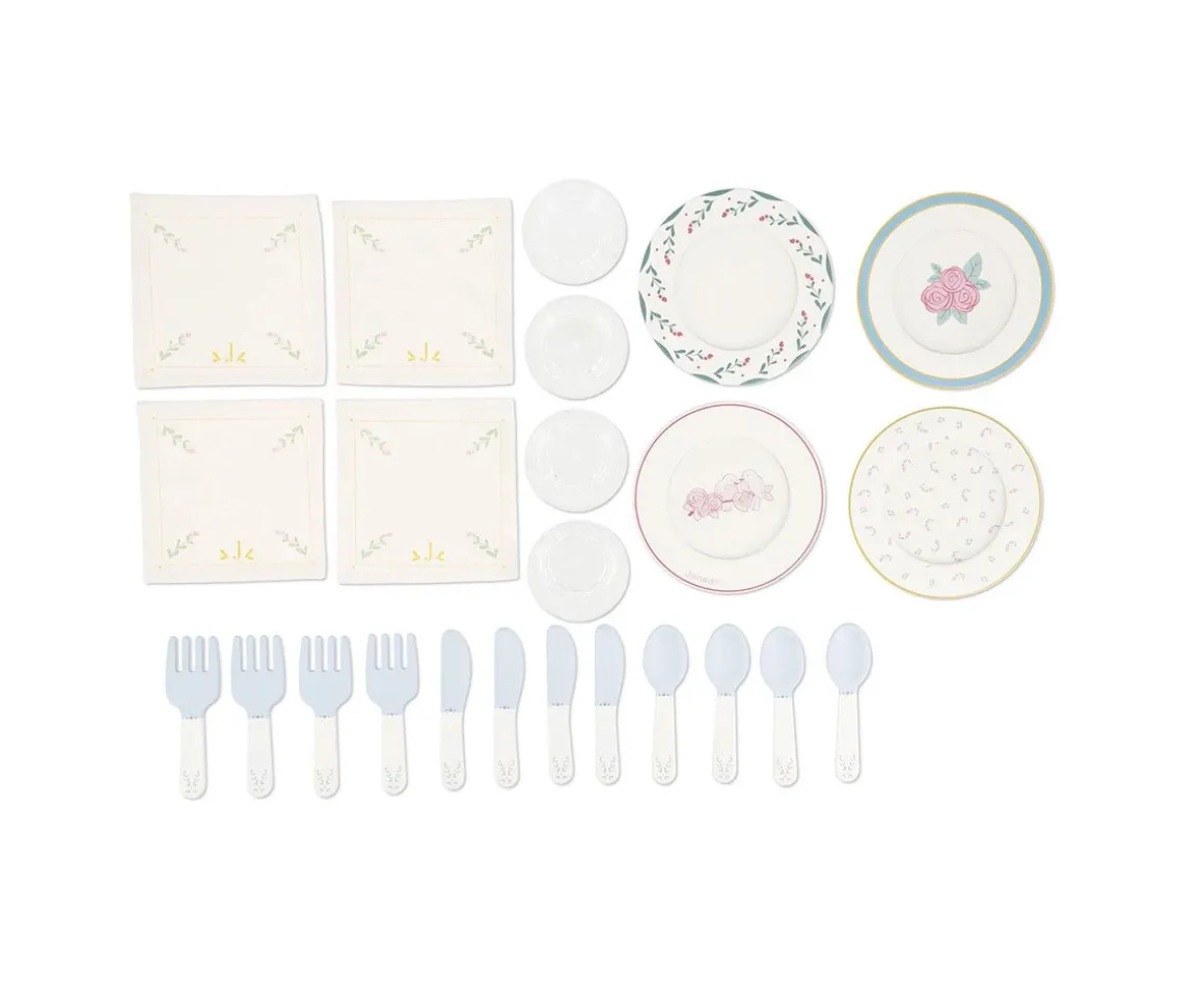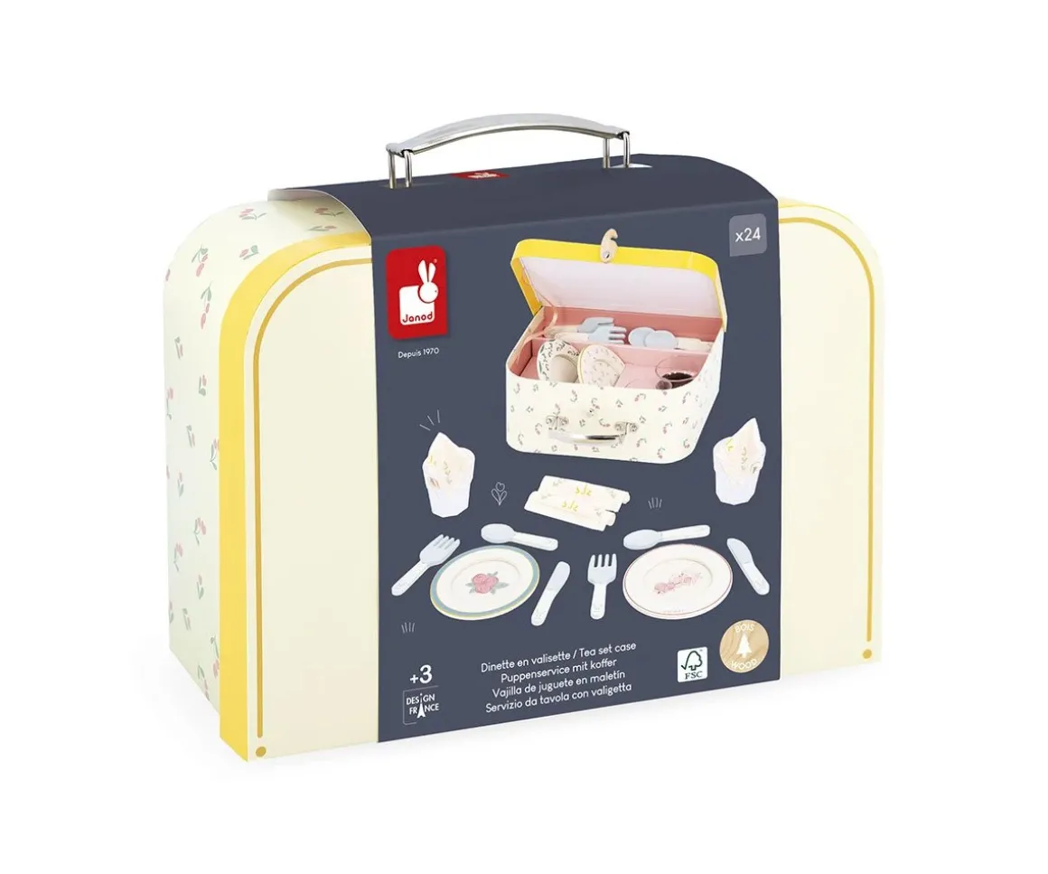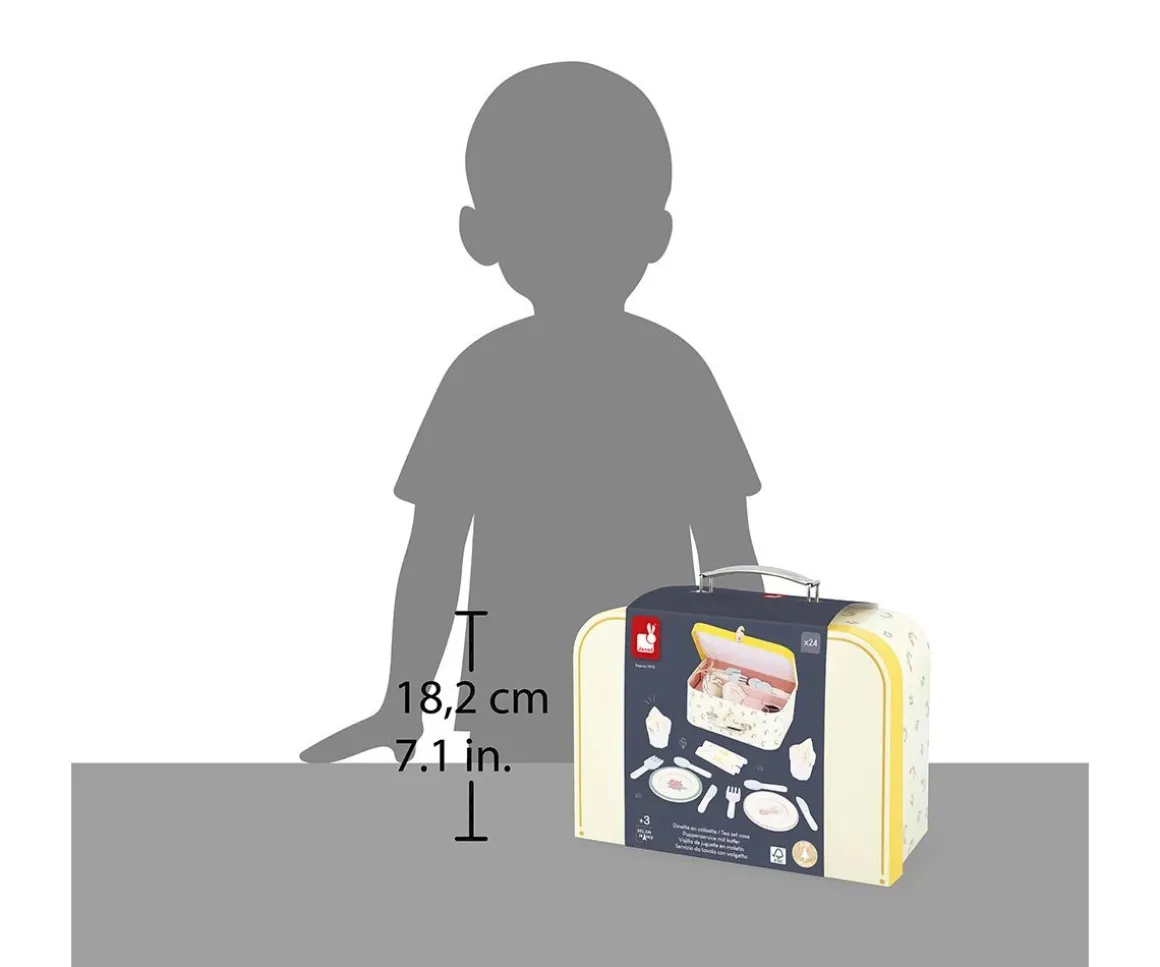 Este adorable maletín incluye todos los utensilios de madera necesarios para prepara una mesa de comida, merienda o cena para 4 personas. Ideal para llevar a cualquier parte y crear todo tipo de historias y juegos.