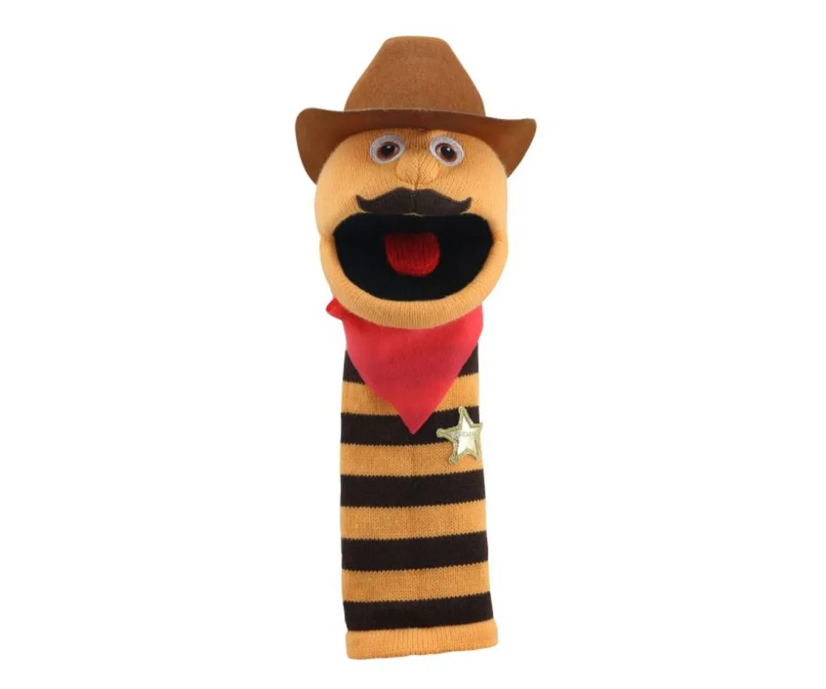 Este simpático muñeco de mano, con su sombrero de vaquero, pañuelo al cuello y placa de sheriff, trae todo el encanto del Viejo Oeste directo al juego de tus hijos. Sus llamativas rayas naranja y marrón, junto con sus ojos bordados y su expresiva carita, lo convierten en un compañero irresistible para fomentar la imaginación y el juego creativo.