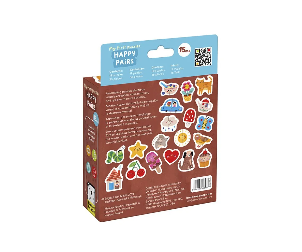 Mi primer puzzle Happy Pairs de ayuda a los peques a desarrollar su destreza, reconocer a los animales, sus sonidos y colores.