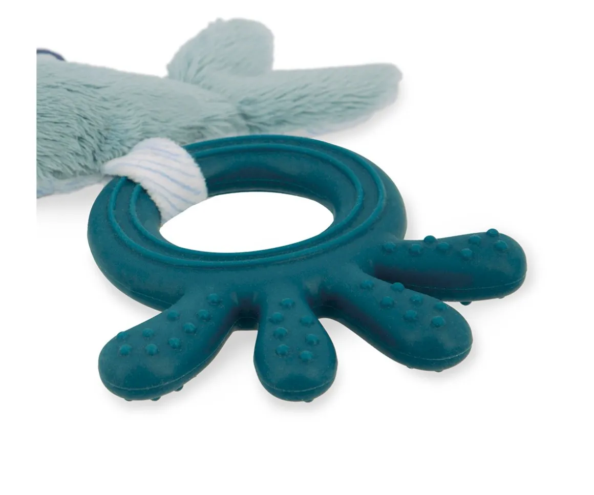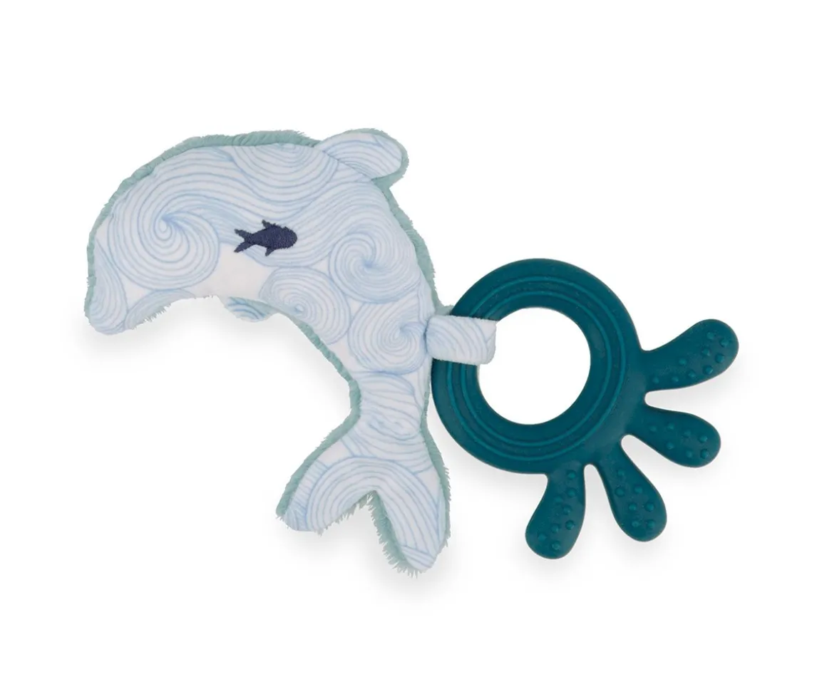 Este anillo de dentición de silicona es el aliado perfecto para aliviar las molestias de las encías del bebé. Diseñado con ranuras y puntos que masajean suavemente las encías, incluye una pequeña muselina suave con forma de delfín que facilita el agarre.