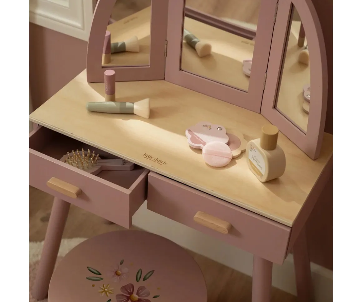 El tocador cuenta con un elegante espejo de tres paneles, perfecto para verse desde todos los ángulos, y amplios cajones donde guardar accesorios, joyitas y sus pequeños tesoros. Incluye seis productos de belleza de madera y un taburete a juego adornado con una delicada ilustración floral, que completa el conjunto y crea un rincón mágico en la habitación infantil.