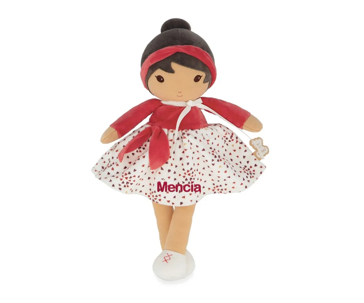 Émilie es una adorable muñeca de tela que lleva puesta una bonita falda con volantes adornada con corazones y una parte superior de color rojo con diadema a juego.
