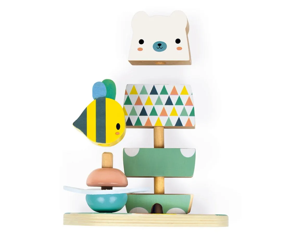 Un bonito juego apilable 2 en 1: un osito en un lado y un panda en el otro, acompañados por su amiguita la abeja. Con este juguete los pequeños aprenderán a insertar cada pieza en el orden correcto