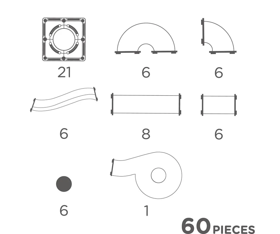 - Incluye: 8 Tubos rectos largos, 6 esquinas, 6 ondas, 6 tubos rectos cortos, 6 tubos en U, 21 cuadrados abiertos, 6 bolas y 1 tazón