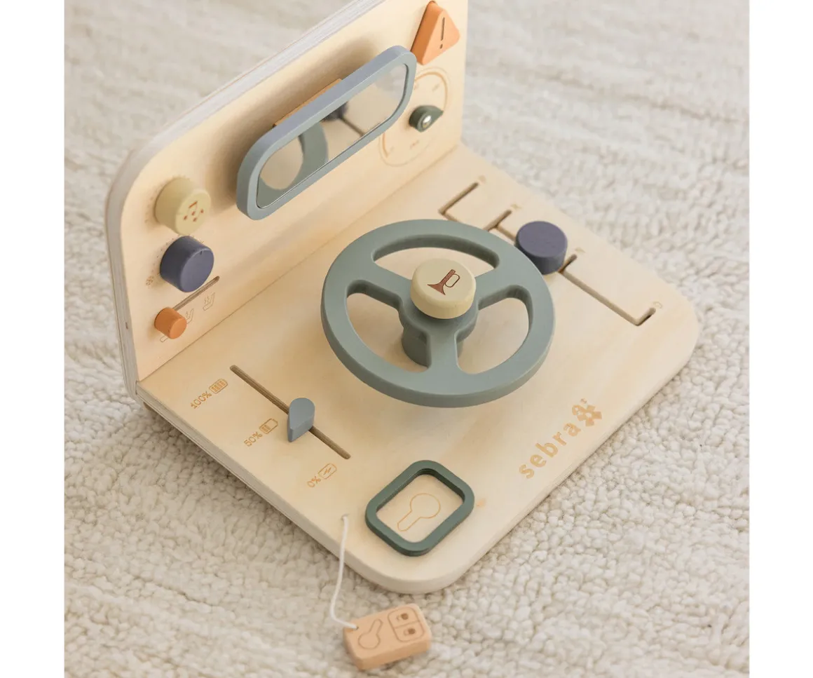 El panel de actividades coche de madera Sebra ofrece a los pequeños amantes de los vehículos una experiencia de juego única, llena de imaginación, movimiento y aprendizaje. Fabricado en madera certificada de alta calidad, este tablero reproduce los detalles de un coche real con un encantador estilo nórdico.