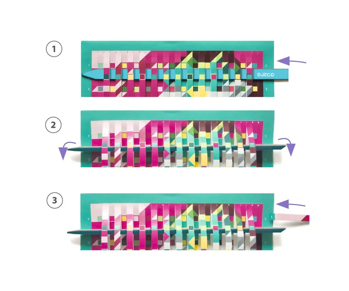 Estupendo set para tejer con tiras de papel y fabricar 4 cuadros estilo pixel art. Los peques deberán deslizar las tiras de papel en la cuadrícula parcilamente impresa. Los robots, extraterrestes y ovnis irán apareciendo poco a poco.