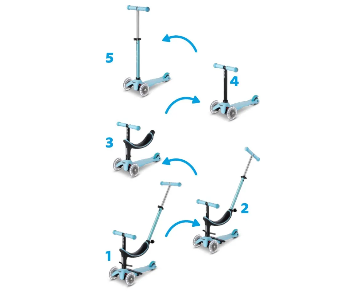 El Micro Mini2Grow es el compañero perfecto para los peques desde los 12 meses. Se puede utilizar en diferentes variantes: con asiento, dos opciones de reposapiés y barra de empuje para los padres y sin barra de empuje, como una mezcla entre bicicleta de equilibrio y patinete, y finalmente como un Mini Micro Deluxe clásico.