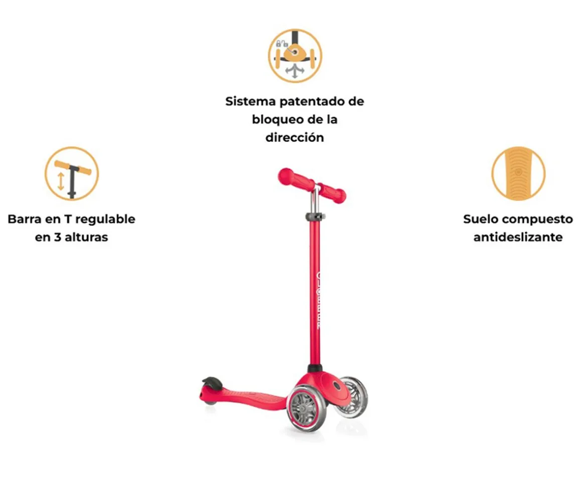 Patinete de 3 ruedas repleto de características que incluye el sistema de bloqueo de dirección patentado de Globber, barra en T ajustable de 3 alturas y una cubierta duradera. El modelo Primo, puede ayudar a los niños a desarrollar de forma segura el equilibrio y las habilidades de coordinación mientras disfrutan de toda la diversión.