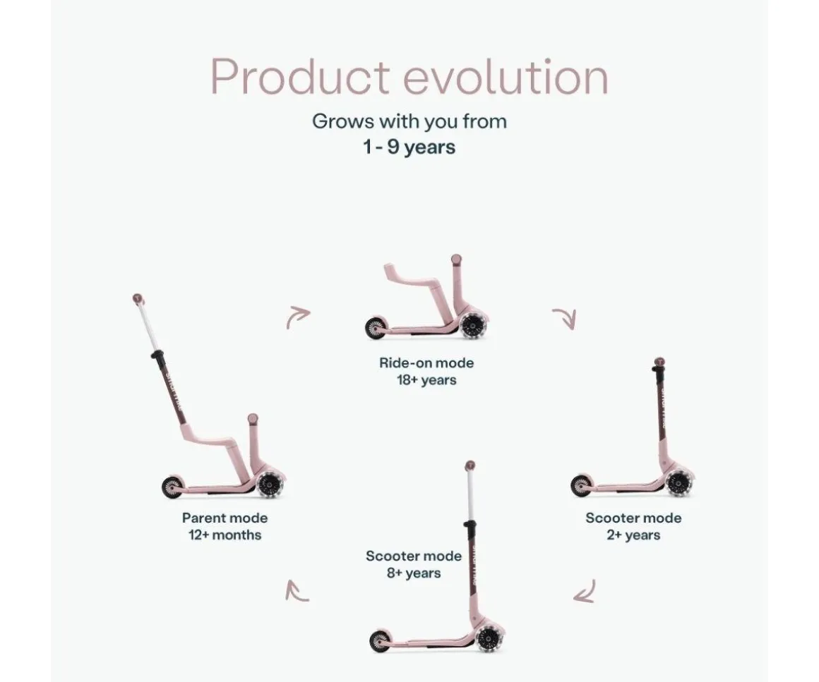 Desde una bicicleta para caminar acompañado, un scooter, hasta un patinete con manillar extensible para adaptarlo a la altura de tu peque por lo que este patinete pueden utilizarlo desde un añito hasta los 9.Cuenta con un práctico y cómodo asiento para sus dos primeras etapas.