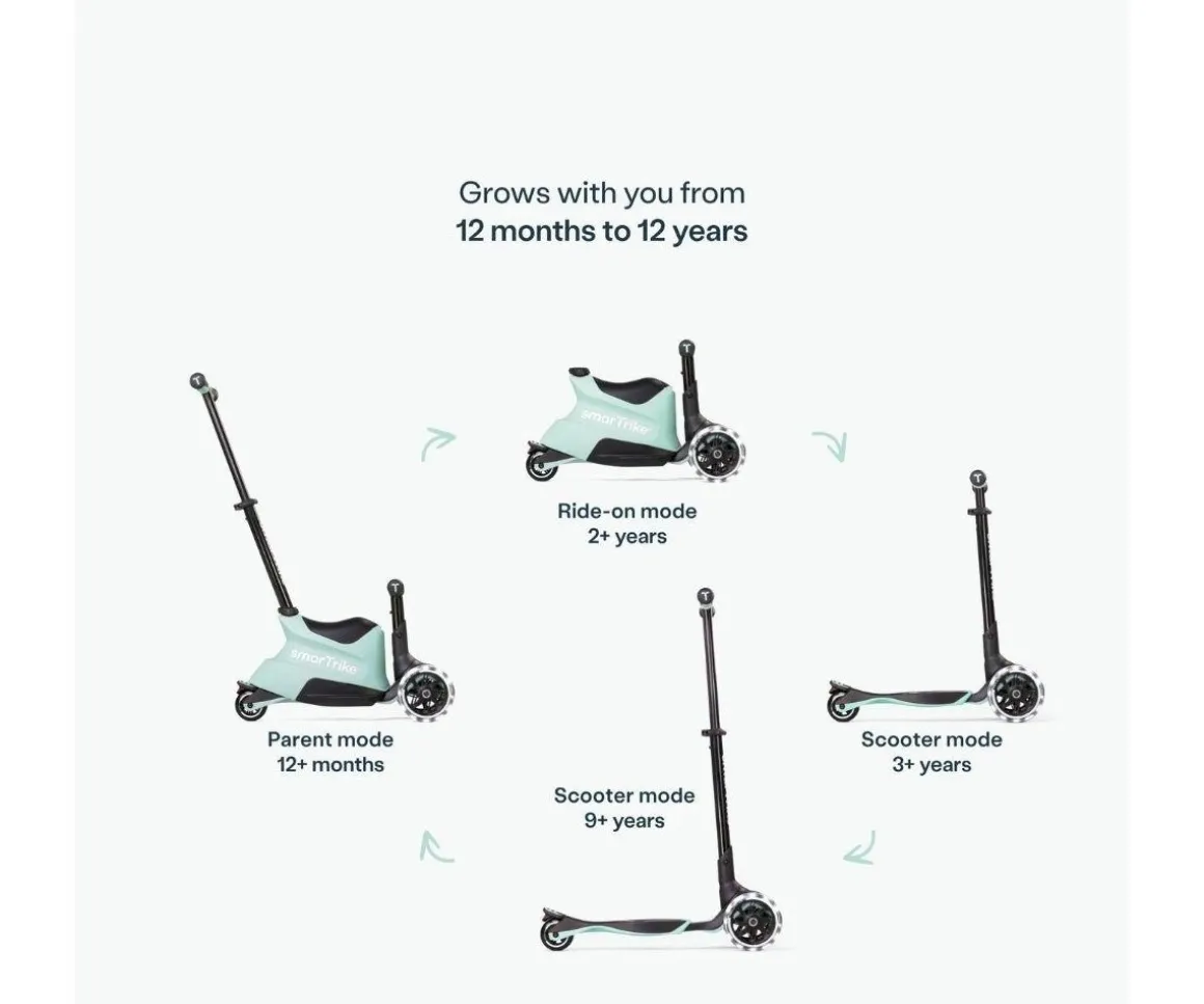 Comienza usando este patinete como un vehículo dirigido por los padres. Cuando tu peque sea más independiente conviértelo en scooter para que empuje con sus piernas, posteriormente lo puedes transformar en un patinete con manillar extensible.