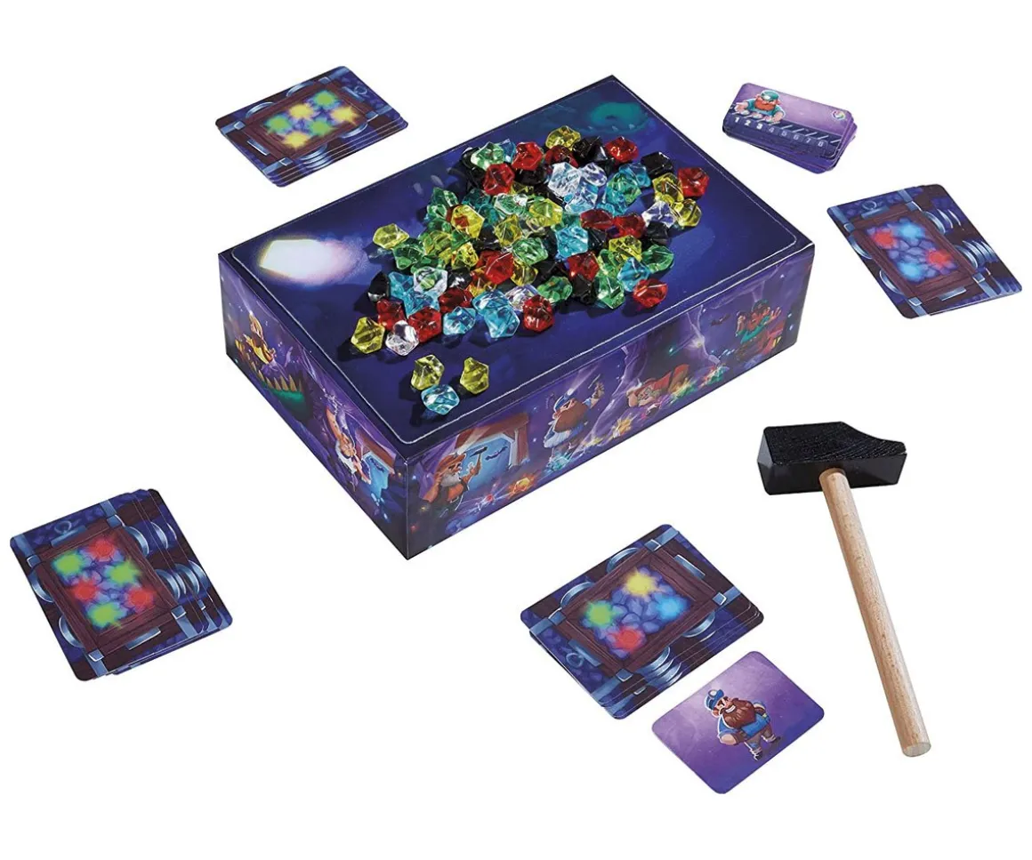 - Incluye: 15 cartas grandes con vagoneta, 9 cartas de tarea, 1 carta de jugador, un martillo, 90 piedras preciosas, 1 estrella adhesiva, una caja, un dado