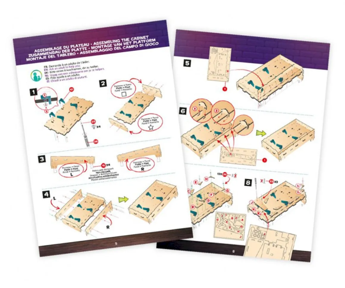 - Incluye: 4 paneles de madera, 1 marcador electrónico, 1 altavoz, 1 compartimento para pilas, 4 soportes para parachoques, 4 muelles, 4 bases para parachoques, 2 LED verdes, 2 LED azules, 4 aletas, 1 botón largo, 1 botón corto, 1 émbolo, 1 resorte grande, 4 almohadillas antideslizantes, 2 bolas, 4 arandelas grandes, 1 arandela pequeña, 1 adhesivo, 4 bandas elásticas, 2 bandas elásticas rojas, 18 tornillos con bridas, 4 tornillos largos, 4 tornillos largos, 2 tornillos medianos y 2 tuercas, 15 tornillos cortos, 1 destornillador e instrucciones