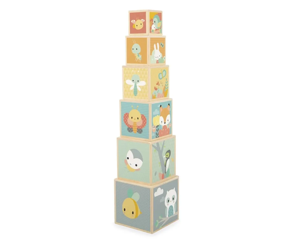 Cada uno de los 6 cubos que forman esta pirámide tiene 5 caras decoradas con animales, números, animales en su entorno, animales sobre fondos de color y formas geométricas perforadas.