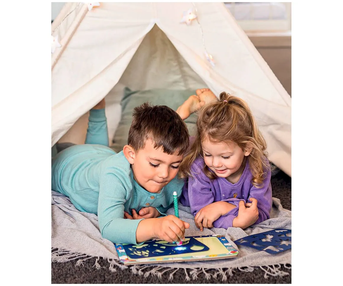 Los peques lo pasarán en grande dibujando con luz sus propias creaciones o utilizando las plantillas. Los dibujos desaparecerán después de un tiempo y podrás crear un nuevo espacio para más dibujos.