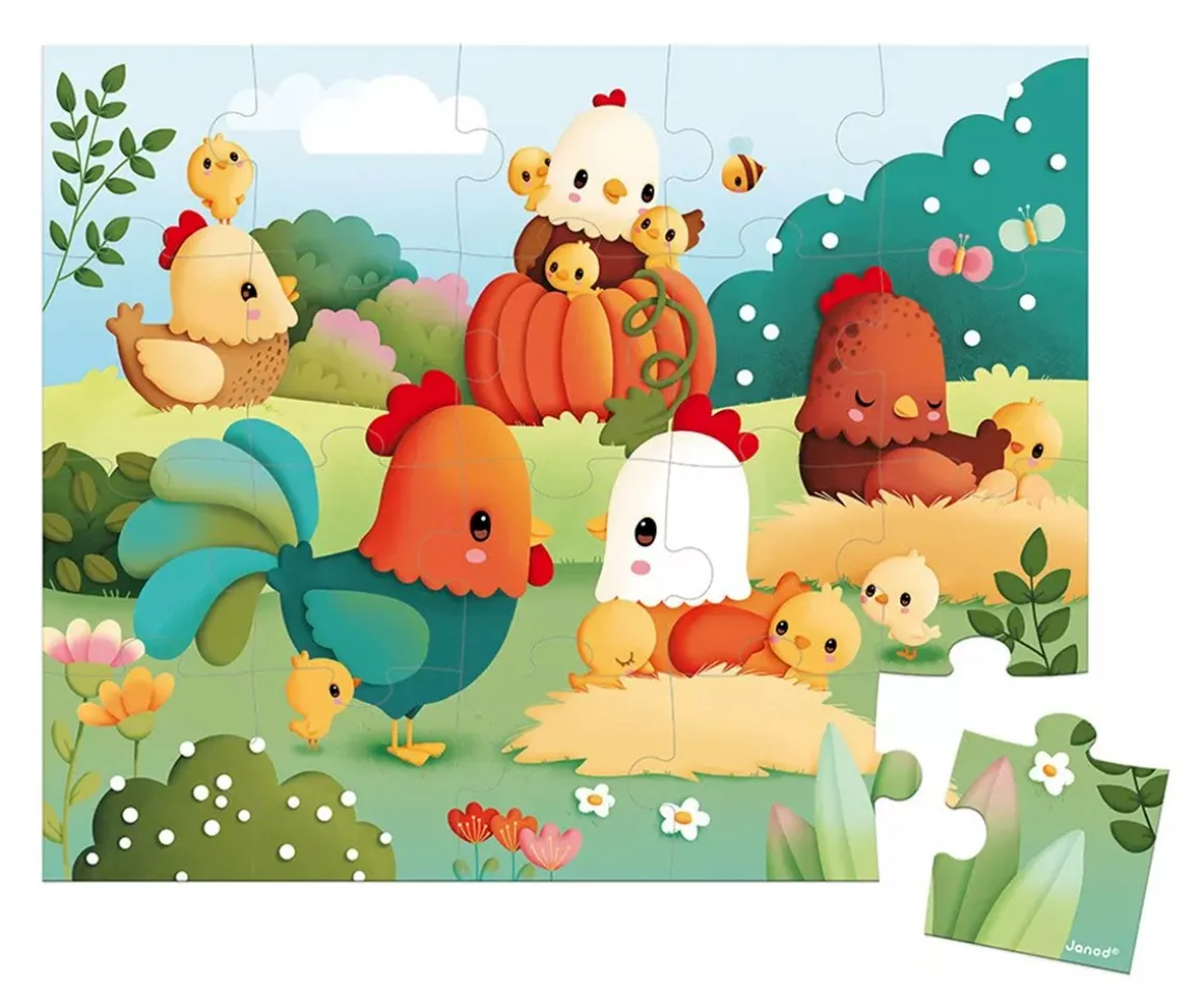 ¡Explora los animalitos de la granja y el paisaje con este puzzle tan colorido! Con 20 piezas de gran tamaño, los peques podrán iniciarse en la concentración, la lógica, la calma y la motricidad con los puzzles Janod.