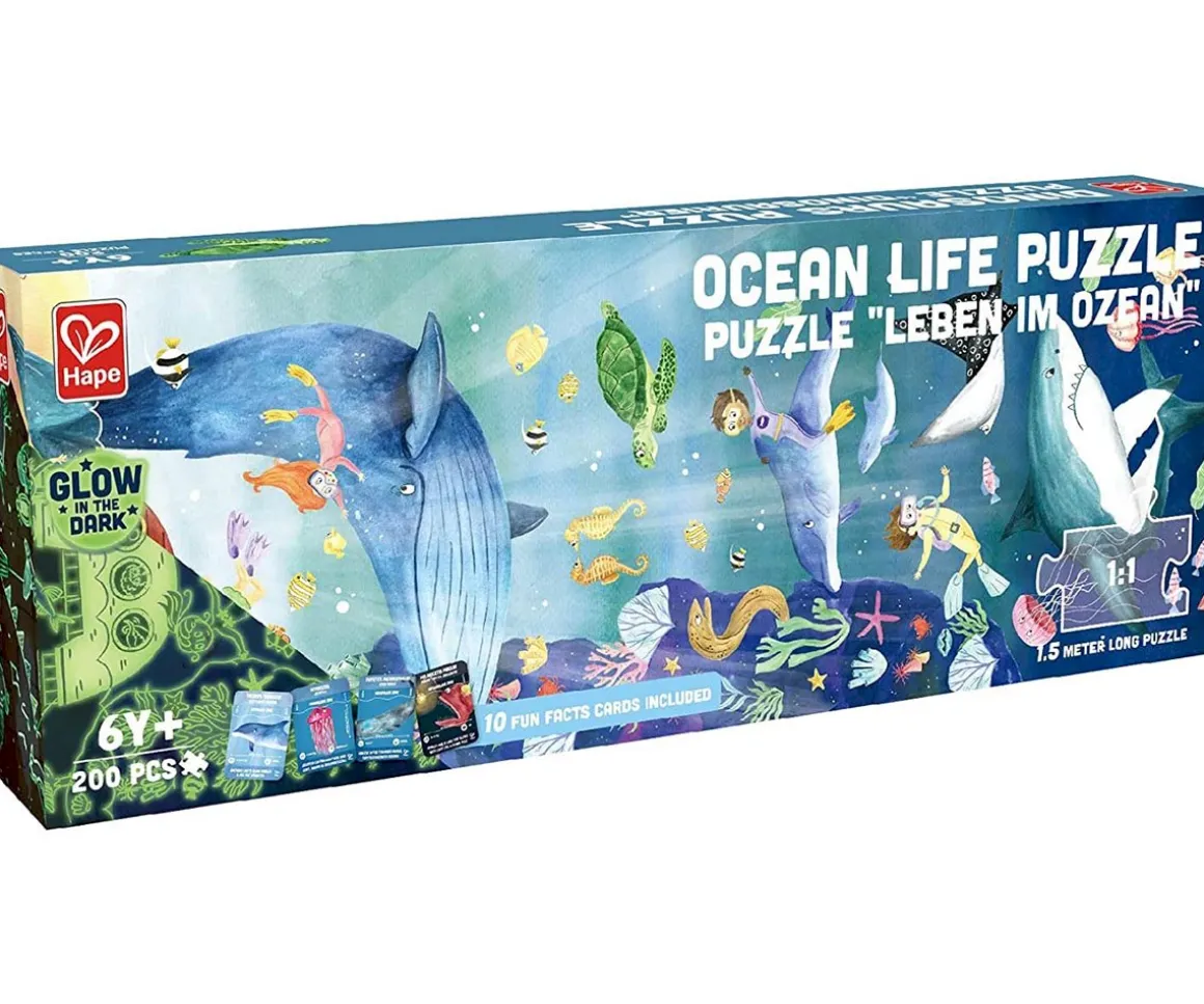 Bonito puzzle fondo marino océano de 200 piezas ¡que brilla en la oscuridad! Observa cada detalle y conoce a cada uno de ellos con esta bonita ilustración de 1,5 metros y sus 10 cartas con sus nombres y características.