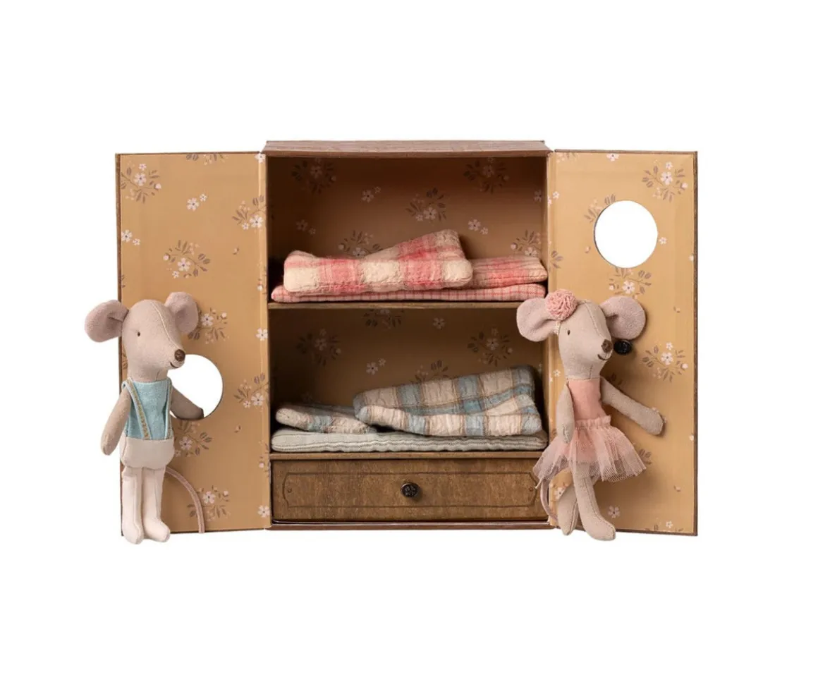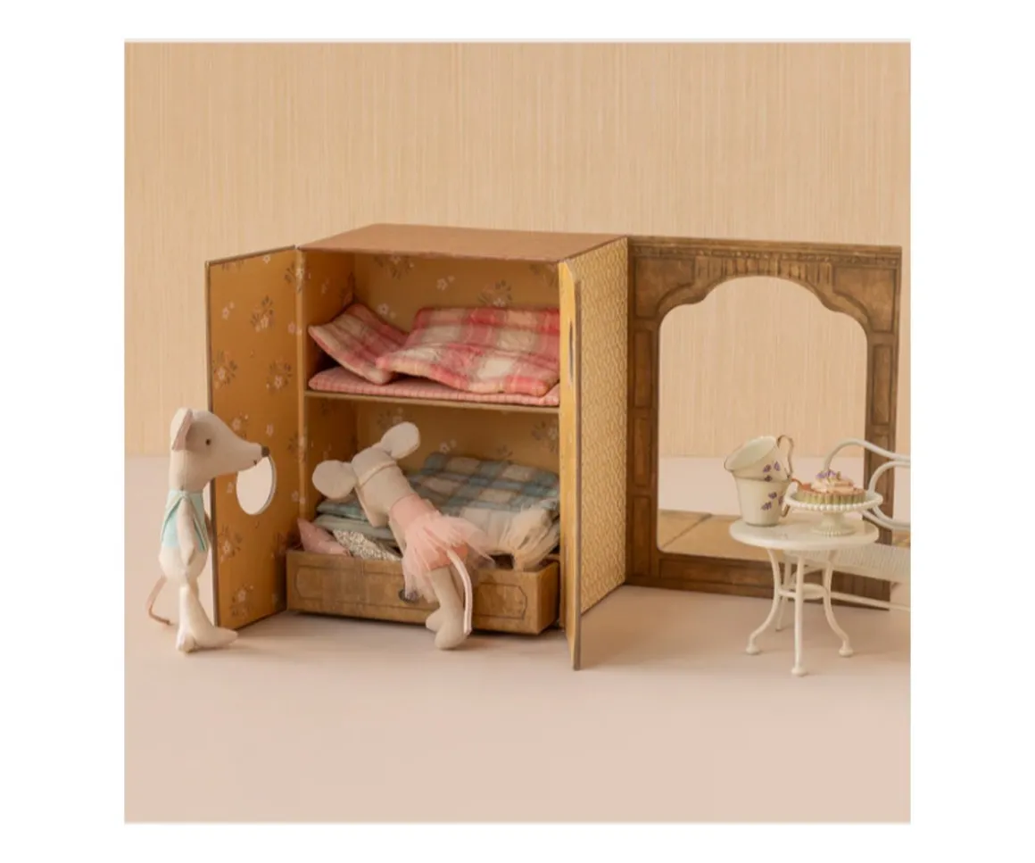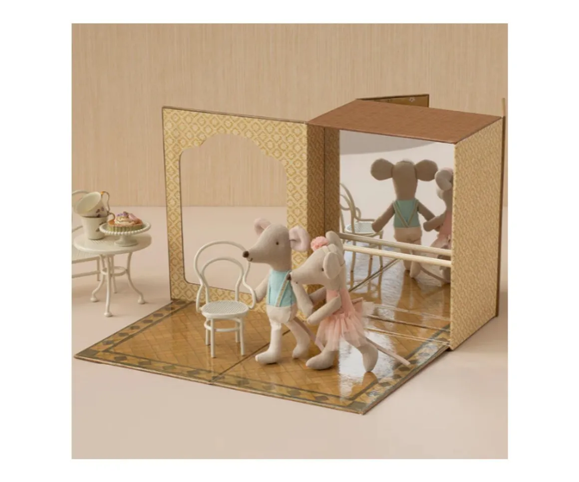 Un elegante estudio de danza, donde dos ratoncitos ,hermana y hermano,practican sus pasos con gracia y alegría. Incluye una caja de papel resistente que se despliega como una mini habitación: un estudio de ballet y, al cerrarse, se convierte en su acogedor hogar.