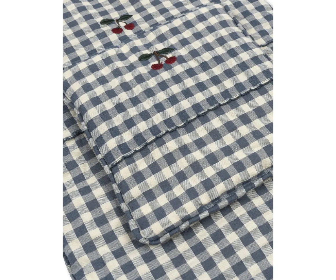 Ropa de cama para muñecas de la marca Konges Slojd. Estampada con la colección Blue Check, es acolchada y tiene ribetes suaves, viene en una bolsa de tela a juego con cierre de cordón.